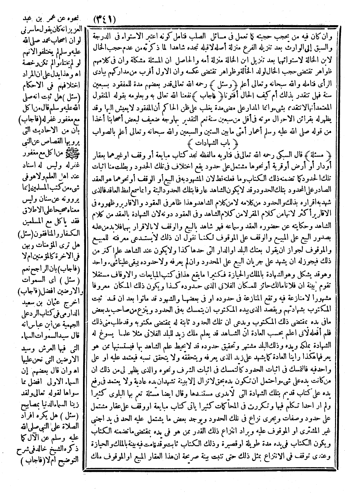 (مَسْأَلَة) قَالَ السُّبْكِيّ - رَحِمَهُ اللَّهُ تَعَالَى - فِي فَتَاوِيهِ مَا لَفْظُهُ نَجِدُ كِتَابَ مُبَايَعَةٍ أَوْ وَقْفٍ أَوْ غَيْرِهِمَا بِعَقَارِ أَوْ دَارٍ أَوْ أَرْضٍ أَوْ قَرْيَةٍ أَوْ نَحْوِهَا مُشْتَمِلٌ عَلَى حُدُودٍ يَقَعُ اخْتِلَافٌ فِي تِلْكَ الْحُدُودِ وَبَطَلَتْ مِنَّا إثْبَاتُ تِلْكَ الْحُدُودِ كَمَا تَضَمَّنَهُ ذَلِكَ الْكِتَابُ وَمَا فَعَلَتُهُ قَطُّ لِأَنَّ الْمَشْهُودَ بِهِ فِي الْبَيْعِ أَوْ الْوَقْفِ أَوْ نَحْوِهِمَا هُوَ الْعَقْدُ الصَّادِرُ عَلَى الْمَحْدُودِ بِتِلْكَ الْحُدُودِ وَقَدْ لَا يَكُونُ الشَّاهِدُ عَارِفًا بِتِلْكَ الْحُدُودِ أَلْبَتَّةَ وَإِنَّمَا سَمِعَ لَفْظَ الْعَاقِدِ فَاَلَّذِي شَهِدَ بِهِ إقْرَارُهُ بِذَلِكَ وَالْحُدُودُ مِنْ كَلَامِهِ لَا مِنْ كَلَامِ الشَّاهِدِ وَهَذَا ظَاهِرٌ فِي الْعُقُودِ وَالْأَقَارِيرِ وَظُهُورُهُ فِي الْأَقَارِيرِ أَكْثَرُ لِأَنَّهُمَا مِنْ كَلَامِ الْمُقِرِّ لَا مِنْ كَلَامِ الشَّاهِدِ وَفِي الْعُقُودِ دُونَهُ لِأَنَّ الشَّهَادَةَ بِالْعَقْدِ مِنْ كَلَامِ الشَّاهِدِ وَحِكَايَتِهِ عَنْ حُضُورِهِ الْعَقْدَ وَسَمَاعِهِ فَهُوَ شَاهِدٌ بِالْبَيْعِ وَالْوَقْفِ لَا بِالْإِقْرَارِ بِهِمَا فَلَا بُدَّ مِنْ عِلْمِهِ بِصُدُورِ الْبَيْعِ عَلَى الْمَبِيعِ وَالْوَقْفِ عَلَى الْمَوْقُوفِ.
