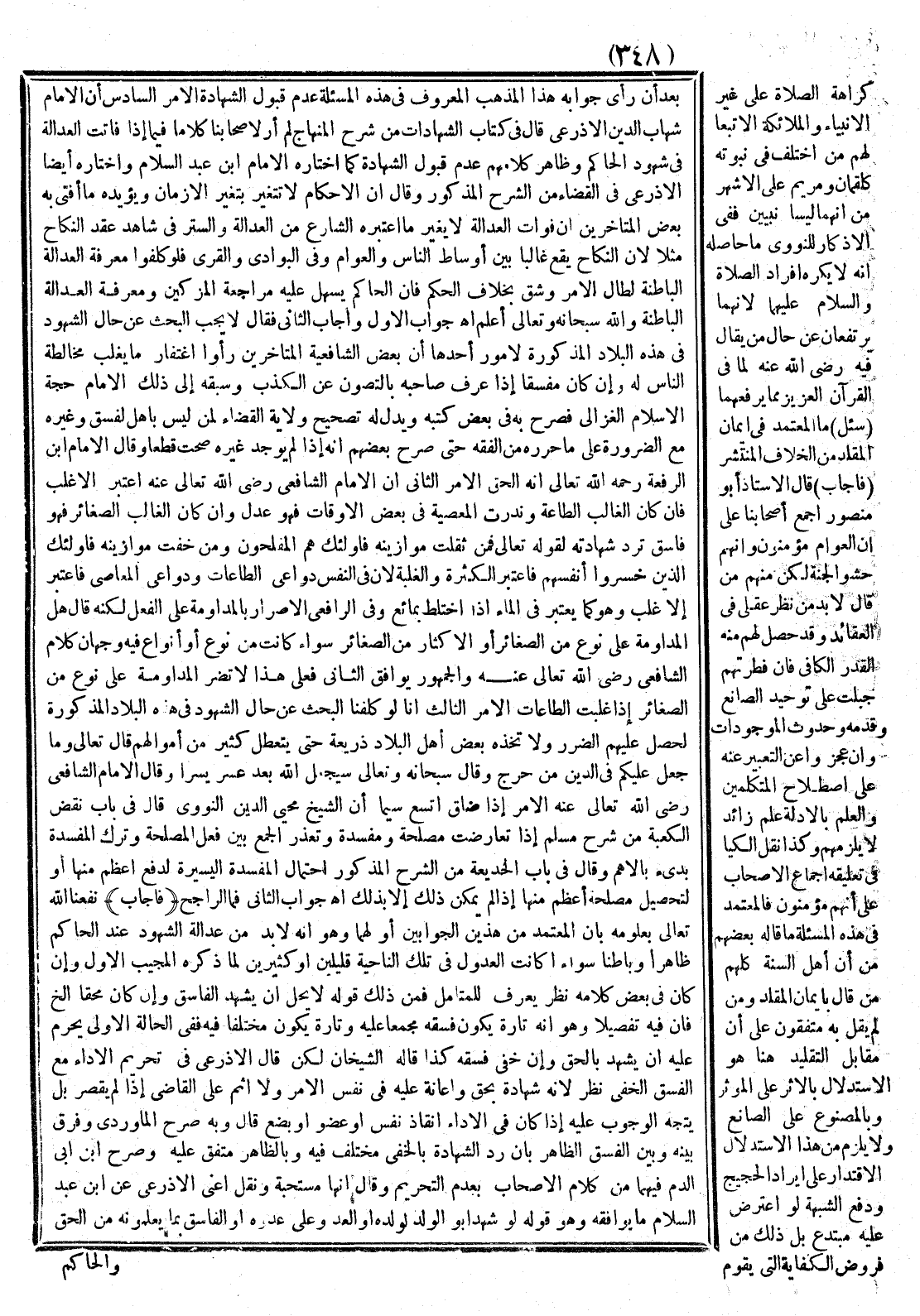 بَعْد أَنْ رَأَى جَوَابَهُ هَذَا الْمَذْهَبُ الْمَعْرُوفُ فِي هَذِهِ الْمَسْأَلَةِ عَدَمُ قَبُولِ الشَّهَادَةِ الْأَمْرُ السَّادِسُ أَنَّ الْإِمَامَ شِهَابَ الدِّينِ الْأَذْرَعِيَّ قَالَ فِي كِتَابِ الشَّهَادَاتِ مِنْ شَرْحِ الْمِنْهَاجِ لَمْ أَرَ لِأَصْحَابِنَا كَلَامًا فِيمَا إذَا فَاتَتْ الْعَدَالَةُ فِي شُهُودِ الْحَاكِمِ وَظَاهِرُ كَلَامِهِمْ عَدَمُ قَبُولِ الشَّهَادَةِ كَمَا اخْتَارَهُ الْإِمَامُ ابْنُ عَبْدِ السَّلَامِ وَاخْتَارَهُ أَيْضًا الْأَذْرَعِيُّ فِي الْقَضَاءِ مِنْ الشَّرْحِ الْمَذْكُورِ وَقَالَ أَنَّ الْأَحْكَامَ لَا تَتَغَيَّرُ بِتَغَيُّرِ الْأَزْمَانِ وَيُؤَيِّدُهُ مَا أَفْتَى بِهِ بَعْضُ الْمُتَأَخِّرِينَ أَنَّ فَوَاتَ الْعَدَالَةِ لَا يُغَيِّرُ مَا اعْتَبَرَهُ الشَّارِعُ مِنْ الْعَدَالَةِ وَالسِّتْرِ فِي شَاهِدِ عَقْدِ النِّكَاحِ مَثَلًا لِأَنَّ النِّكَاحَ يَقَعُ غَالِبًا بَيْنَ أَوْسَاطِ النَّاسِ وَالْعَوَامِّ وَفِي الْبَوَادِي وَالْقُرَى فَلَوْ كُلِّفُوا مَعْرِفَةَ الْعَدَالَةِ الْبَاطِنَةِ لَطَالَ الْأَمْرُ وَشَقَّ بِخِلَافِ الْحُكْمِ فَإِنَّ الْحَاكِمَ يَسْهُلُ عَلَيْهِ مُرَاجَعَةُ الْمُزَكِّينَ وَمَعْرِفَةُ الْعَدَالَةِ الْبَاطِنَةِ وَاَللَّهُ سُبْحَانَهُ تَعَالَى أَعْلَمُ. اهـ جَوَابُ الْأَوَّلِ.
