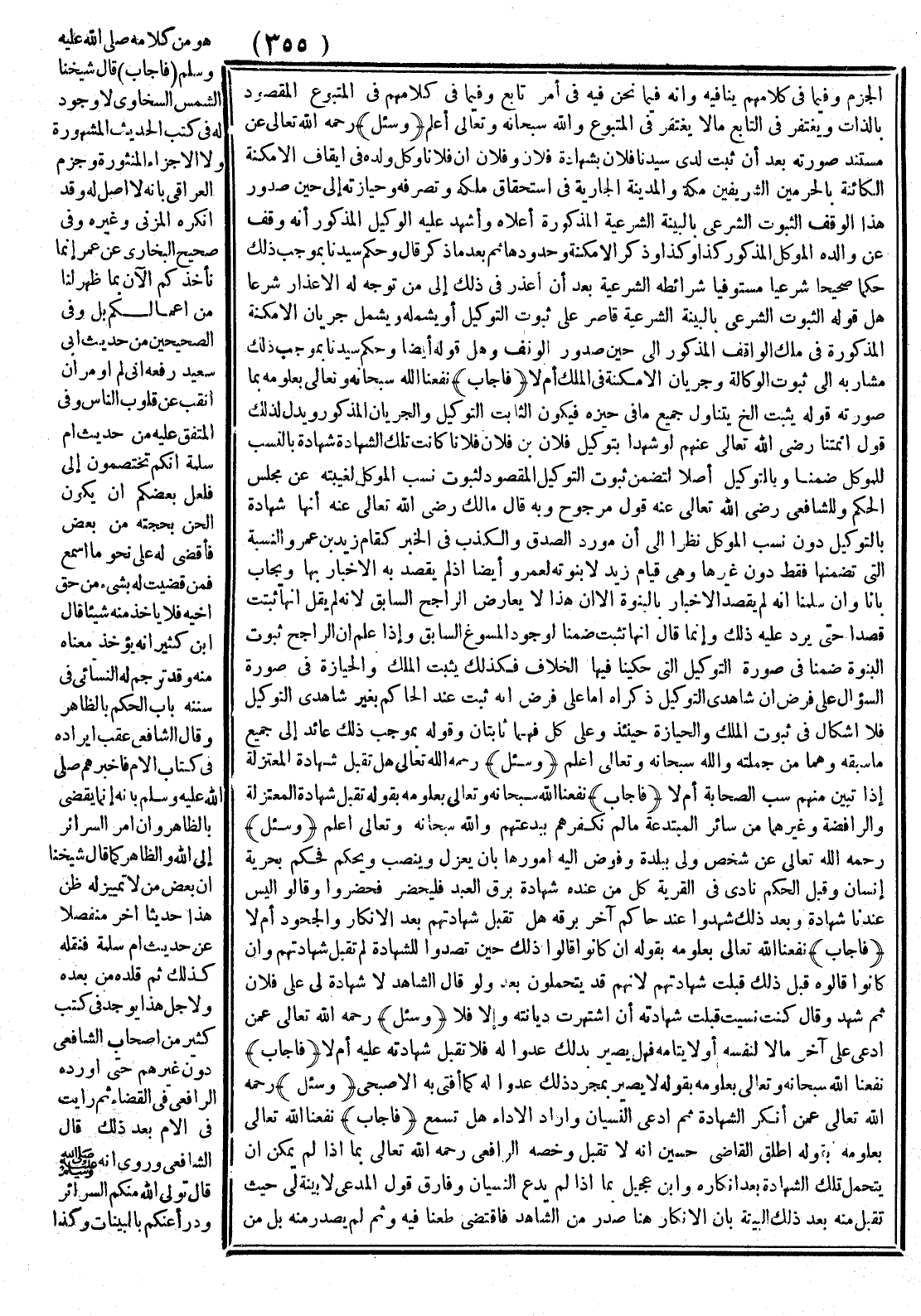 (فَأَجَابَ) نَفَعَنَا اللَّهُ سُبْحَانَهُ وَتَعَالَى بِعُلُومِهِ بِمَا صُورَته قَوْلُهُ يَثْبُتُ إلَخْ يَتَنَاوَلُ جَمِيعَ مَا فِي حَيِّزِهِ فَيَكُونَ الثَّابِتُ التَّوْكِيلَ وَالْجَرَيَانَ الْمَذْكُورَ وَيَدُلُّ لِذَلِكَ قَوْلُ أَئِمَّتنَا - رَضِيَ اللَّهُ تَعَالَى عَنْهُمْ - لَوْ شَهِدَا بِتَوْكِيلِ فُلَانِ بْنِ فُلَانٍ فُلَانًا كَانَتْ تِلْكَ الشَّهَادَةُ شَهَادَةً بِالنَّسَبِ لِلْمُوَكِّلِ ضِمْنًا وَبِالتَّوْكِيلِ أَصْلًا لِتَضَمُّنِ ثُبُوتِ التَّوْكِيلِ الْمَقْصُودِ لِثُبُوتِ نَسَبِ الْمُوَكِّل لِغَيْبَتِهِ عَنْ مَجْلِسِ الْحُكْمِ وَلِلشَّافِعِيِّ - رَضِيَ اللَّهُ تَعَالَى عَنْهُ - قَوْلٌ مَرْجُوحٌ وَبِهِ قَالَ مَالِكٌ - رَضِيَ اللَّهُ تَعَالَى عَنْهُ - أَنَّهَا شَهَادَةٌ بِالتَّوْكِيلِ دُون نَسَبِ الْمُوَكِّلِ نَظَرًا إلَى أَنَّ مَوْرِدَ الصِّدْقِ وَالْكَذِبِ فِي الْخَبَرِ كَقَامَ زَيْدُ بْنُ عَمْرٍو النِّسْبَة الَّتِي تَضَمَّنَهَا فَقَطْ دُون غَيْرِهَا وَهِيَ قِيَامُ زَيْدٍ لَا بُنُوَّتُهُ لِعَمْرٍو أَيْضًا إذَا لَمْ يَقْصِدْ بِهِ الْإِخْبَارَ بِهَا وَيُجَابُ بِأَنَّا وَإِنْ سَلَّمْنَا أَنَّهُ لَمْ يَقْصِدْ الْإِخْبَارَ بِالْبُنُوَّةِ.