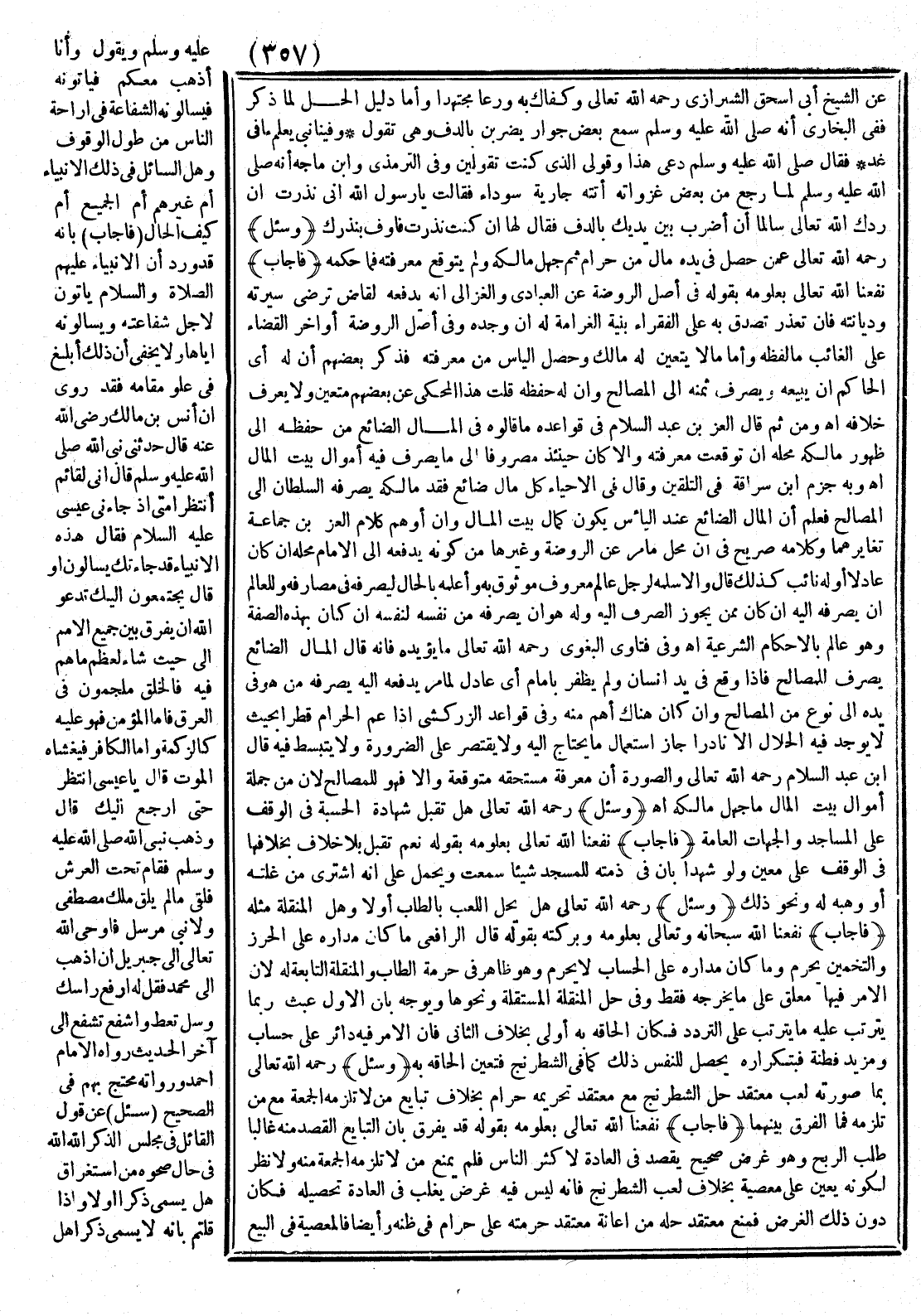 (فَأَجَابَ) نَفَعَنَا اللَّهُ سُبْحَانه وَتَعَالَى بِعُلُومِهِ وَبَرَكَتِهِ بِقَوْلِهِ قَالَ الرَّافِعِيُّ مَا كَانَ مَدَارُهُ عَلَى الْحِرْزِ وَالتَّخْمِينِ يَحْرُمُ وَمَا كَانَ مَدَارُهُ عَلَى الْحِسَابِ لَا يَحْرُمُ وَهُوَ ظَاهِرُ فِي حُرْمَةِ الطَّابِ وَالْمِنْقَلَةِ التَّابِعَةِ لَهُ لِأَنَّ الْأَمْرَ فِيهَا مُعَلَّقٌ عَلَى مَا يُخْرِجهُ فَقَطْ وَفِي حِلِّ الْمَنْقَلَةِ الْمُسْتَقِلَّةِ وَنَحْوهَا وَيُوَجَّهُ بِأَنَّ الْأَوَّلَ عَبَثٌ رُبَّمَا يَتَرَتَّبُ عَلَيْهِ مَا يَتَرَتَّبُ عَلَى النَّرْدِ فَكَانَ إلْحَاقُهُ بِهِ أَوْلَى بِخِلَافِ الثَّانِي فَإِنَّ الْأَمْرَ فِيهِ دَائِرٌ عَلَى حِسَابٍ وَمَزِيدِ فِطْنَةٍ فَبِتَكْرَارِهِ يَحْصُلُ لِلنَّفْسِ ذَلِكَ كَمَا فِي الشِّطْرَنْجِ فَتَعَيَّنَ إلْحَاقُهُ بِهِ.