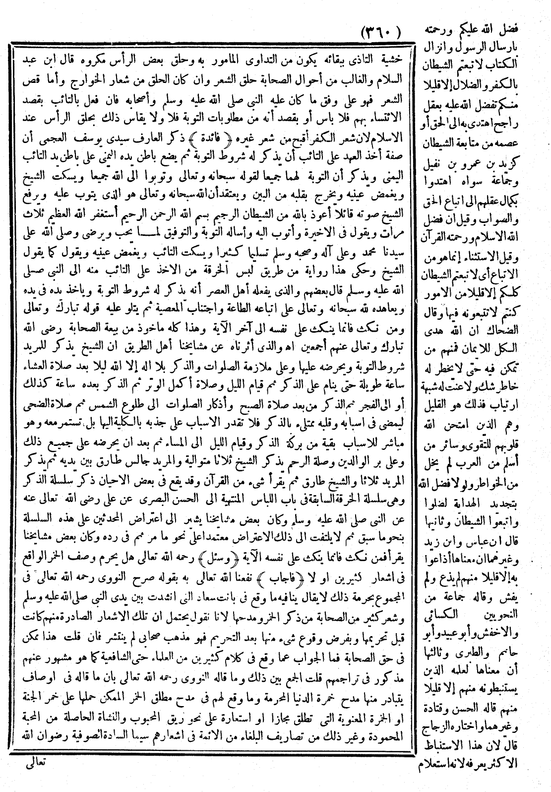 (فَائِدَةٌ) ذَكَرَ الْعَارِفُ سَيِّدِي يُوسُفُ الْعَجَمِيُّ أَنَّ صِفَةَ أَخْذِ الْعَهْدِ عَلَى التَّائِبِ أَنْ يَذْكُرَ لَهُ شُرُوطَ التَّوْبَةِ ثُمَّ يَضَعَ بَاطِنَ يَدِهِ عَلَى بَاطِنِ يَدِ التَّائِبِ الْيُمْنَى وَيَذْكُرُ أَنَّ التَّوْبَةَ لَهُمَا جَمِيعًا لِقَوْلِهِ سُبْحَانه وَتَعَالَى {وَتُوبُوا إِلَى اللَّهِ جَمِيعًا} [النور: 31] وَيَسْكُتُ الشَّيْخُ وَيُغْمِضُ عَيْنَيْهِ وَيَخْرُجُ بِقَلْبِهِ مِنْ الْبَيْنِ وَيَعْتَقِدُ أَنَّ اللَّهَ سُبْحَانه وَتَعَالَى هُوَ الَّذِي يَتُوبُ عَلَيْهِ وَيَرْفَعُ الشَّيْخُ صَوْتَهُ قَائِلًا أَعُوذُ بِاَللَّهِ مِنْ الشَّيْطَانِ الرَّجِيمِ بِسْمِ اللَّهِ الرَّحْمَنِ الرَّحِيمِ أَسْتَغْفِرُ اللَّهَ الْعَظِيمَ ثَلَاثَ مَرَّاتٍ وَيَقُولُ فِي الْأَخِيرَةِ وَأَتُوبُ إلَيْهِ وَأَسْأَلهُ التَّوْبَةَ وَالتَّوْفِيقَ لِمَا يُحِبُّ وَيَرْضَى وَصَلَّى اللَّهُ عَلَى سَيِّدِنَا مُحَمَّدٍ وَعَلَى آلِهِ وَصَحْبِهِ وَسَلَّمَ تَسْلِيمًا كَثِيرًا.