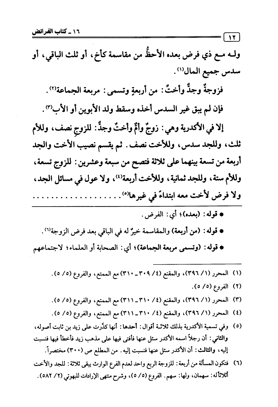 (¬6) فتكون المسألة من أربعة: للزوجة الربع واحد لعدم الفرع الوارث يبقى ثلاثة: للجد والأخت أثلاثًا له: سهمان، ولها: سهم. الفروع (5/ 5)، وشرح منتهى الإرادات للبهوتي (2/ 582).