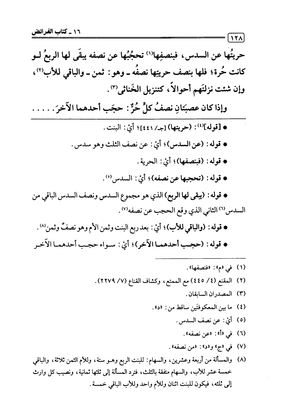 حريتُها عن السدس، فبنصفِها (¬1) تحجُبُها عن نصفه يبقَى لها الربعُ لو كانت حُرة؛ فلها بنصف حريتِها نصفُه -وهو: ثمن- والباقي للأب (¬2)، وإن شئت نزلتَهم أحوالًا، كتنزيل الخَناثى (¬3).