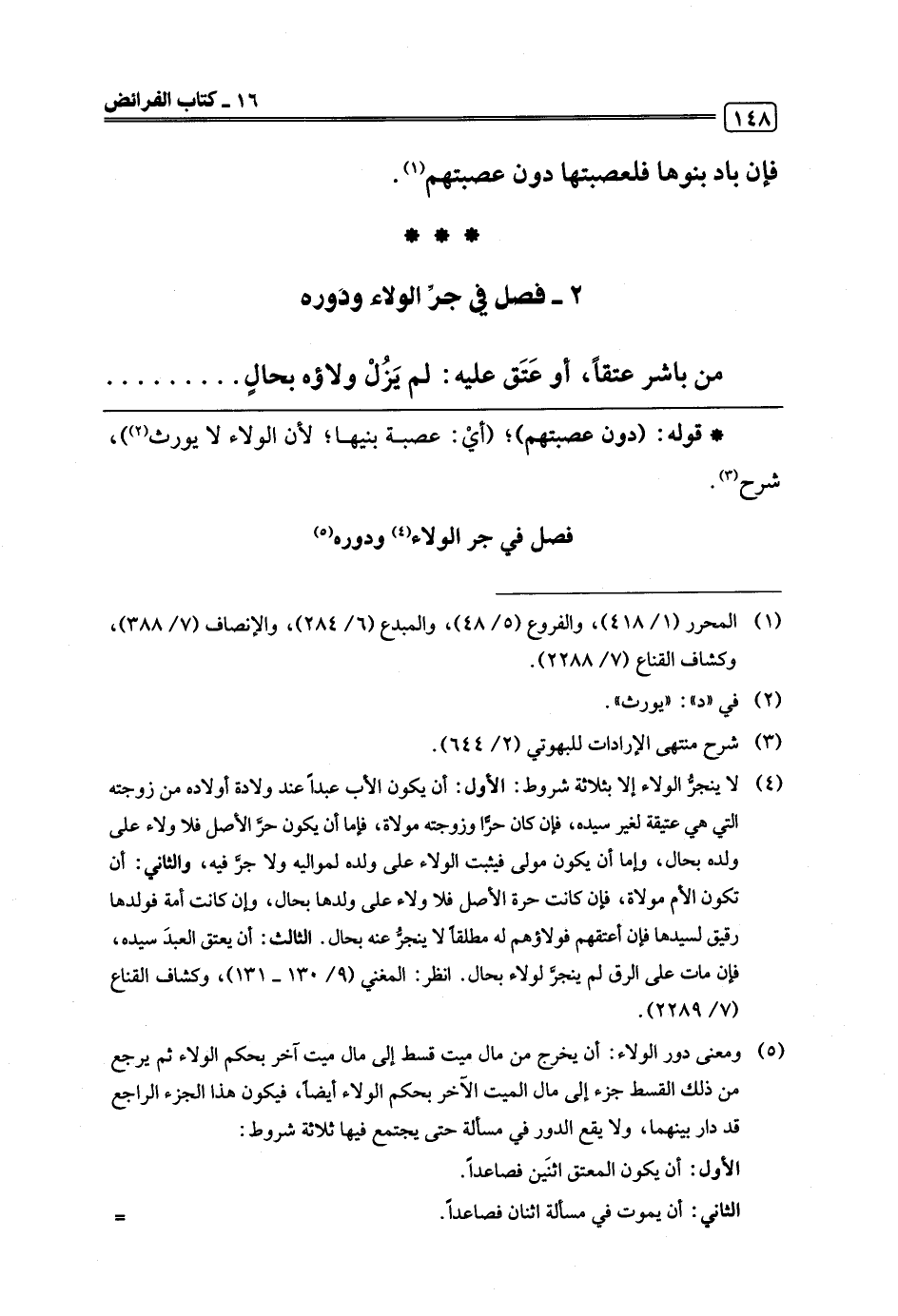 (¬4) لا ينجرُّ الولاء إلا بثلاثة شروط: الأول: أن يكون الأب عبدًا عند ولادة أولاده من زوجته التي هي عتيقة لغير سيده، فإن كان حرًّا وزوجته مولاة، فإما أن يكون حرَّ الأصل فلا ولاء على ولده بحال، وإما أن يكون مولى فيثبت الولاء على ولده لمواليه ولا جرَّ فيه، والثاني: أن تكون الأم مولاة، فإن كانت حرة الأصل فلا ولاء على ولدها بحال، وإن كانت أمة فولدها رقيق لسيدها فإن أعتقهم فولاؤهم له مطلقًا لا ينجرُّ عنه بحال. الثالث: أن يعتق العبدَ سيده، فإن مات على الرق لم ينجرَّ لولاء بحال. انظر: المغني (9/ 130 - 131)، وكشاف القناع (7/ 2289).