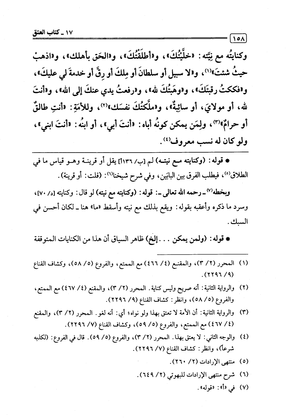 (¬3) والرواية الثانية: أن الأمة لا تعتق بهذا ولو نواه؛ أي: أنه لغو. المحرر (2/ 3)، والمقنع (4/ 467) مع الممتع، والفروع (5/ 59)، وكشاف القناع (7/ 2296).