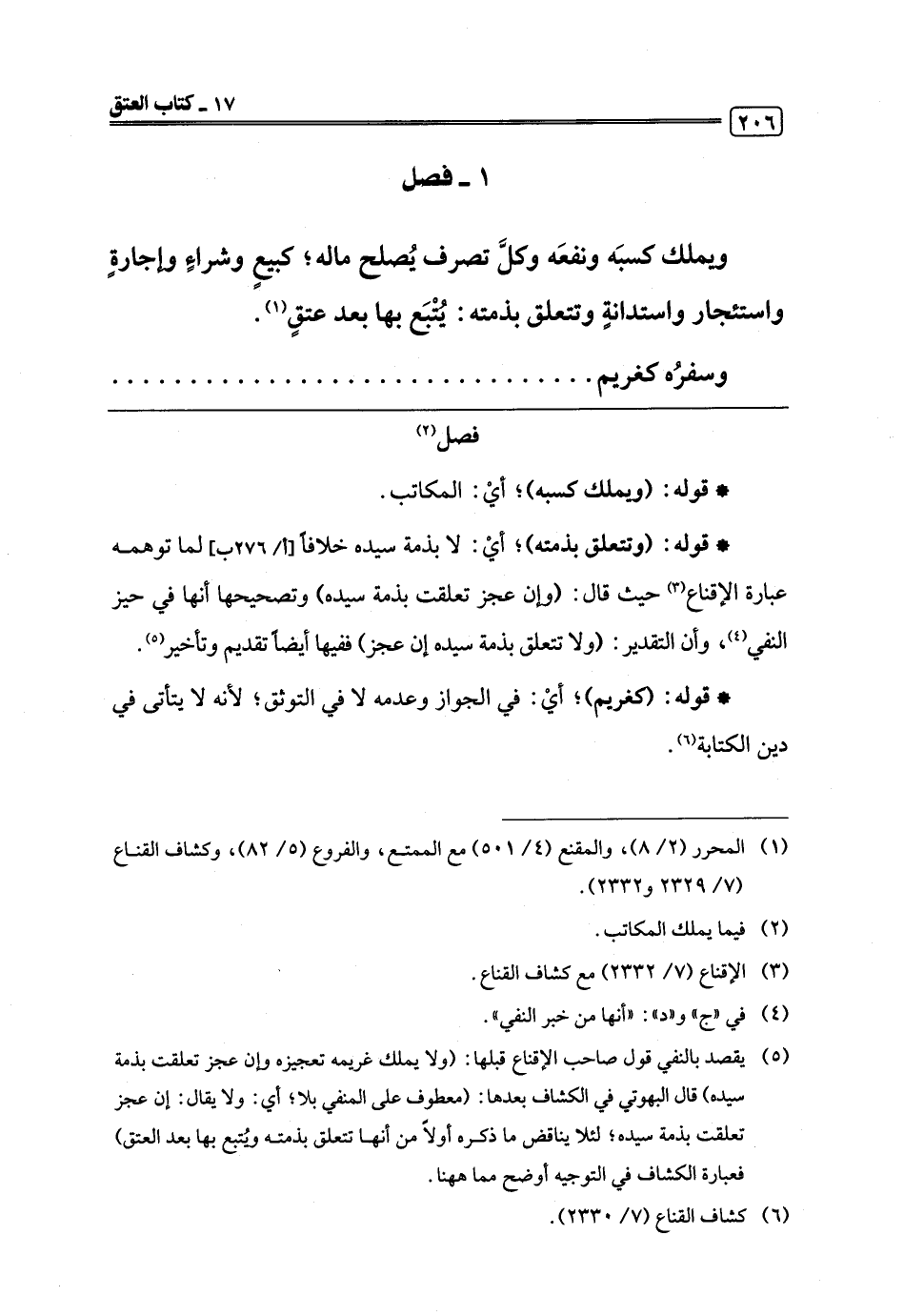 (¬5) يقصد بالنفي قول صاحب الإقناع قبلها: (ولا يملك غريمه تعجيزه وإن عجز تعلقت بذمة سيده) قال البهوتي في الكشاف بعدها: (معطوف على المنفي بلا؛ أيْ: ولا يقال: إن عجز تعلقت بذمة سيده؛ لئلا ينافض ما ذكره أولًا من أنها تتعلق بذمته ويُتبع بها بعد العتق) فعبارة الكشاف في التوجيه أوضح مما ههنا.