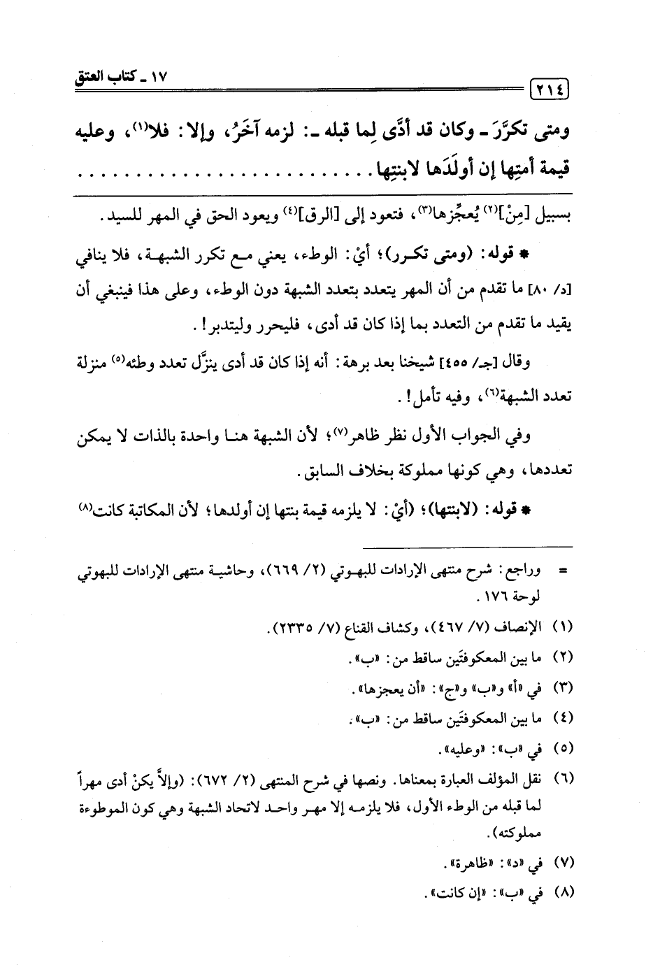 (¬6) نقل المؤلف العبارة بمعناها. ونصها في شرح المنتهى (2/ 672): (وإلَّا يكنْ أدى مهرًا لما قبله من الوطء الأول، فلا يلزمه إلا مهر واحد لاتحاد الشبهة وهي كون الموطوءة مملوكته).
