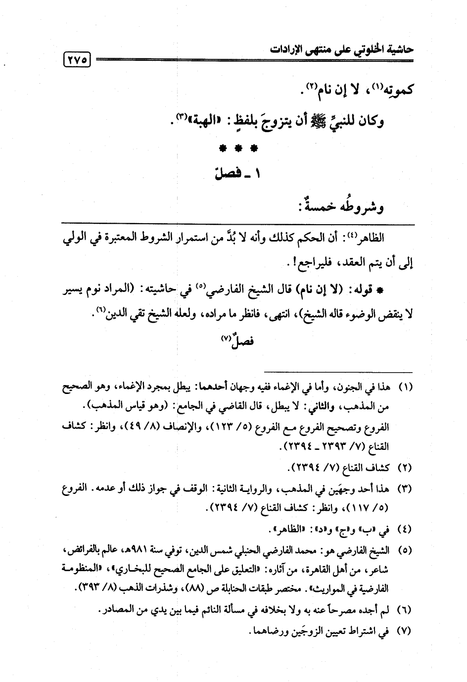(¬5) الشيخ الفارضي هو: محمد الفارضي الحنبلي شمس الدين، توفي سنة 981 هـ، عالم بالفرائض، شاعر، من أهل القاهرة، من آثاره: "التعليق على الجامع الصحيح للبخاري"، "المنظومة الفارضية في المواريث". مختصر طبقات الحنابلة ص (88)، وشذرات الذهب (8/ 393).