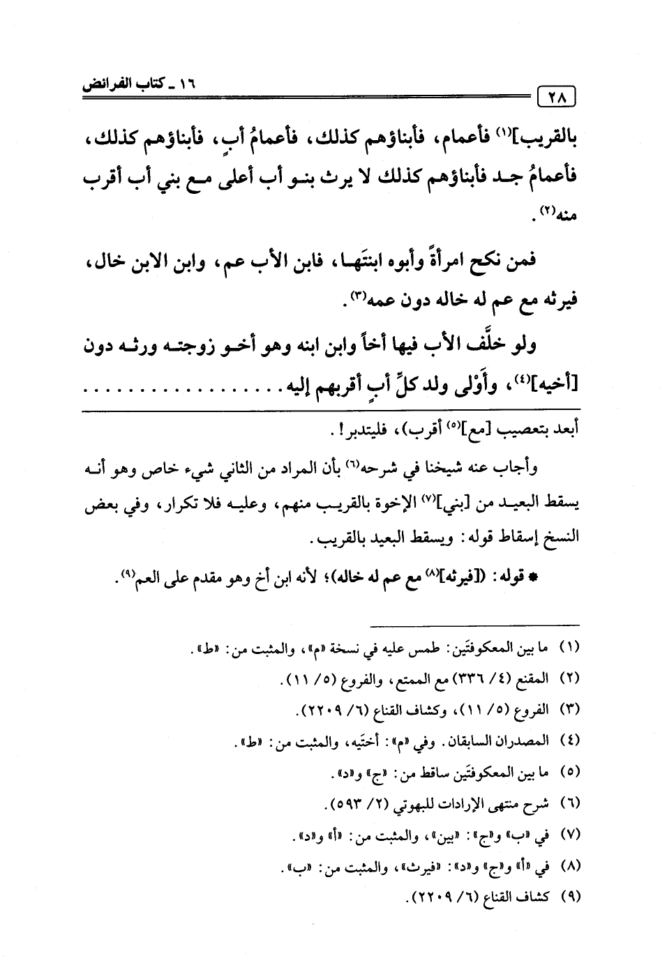 وأجاب عنه شيخنا في شرحه (¬6) بأن المراد من الثاني شيء خاص وهو أنه يسقط البعيد من [بني] (¬7) الإخوة بالقريب منهم، وعليه فلا تكرار، وفي بعض النسخ إسقاط قوله: ويسقط البعيد بالقريب.