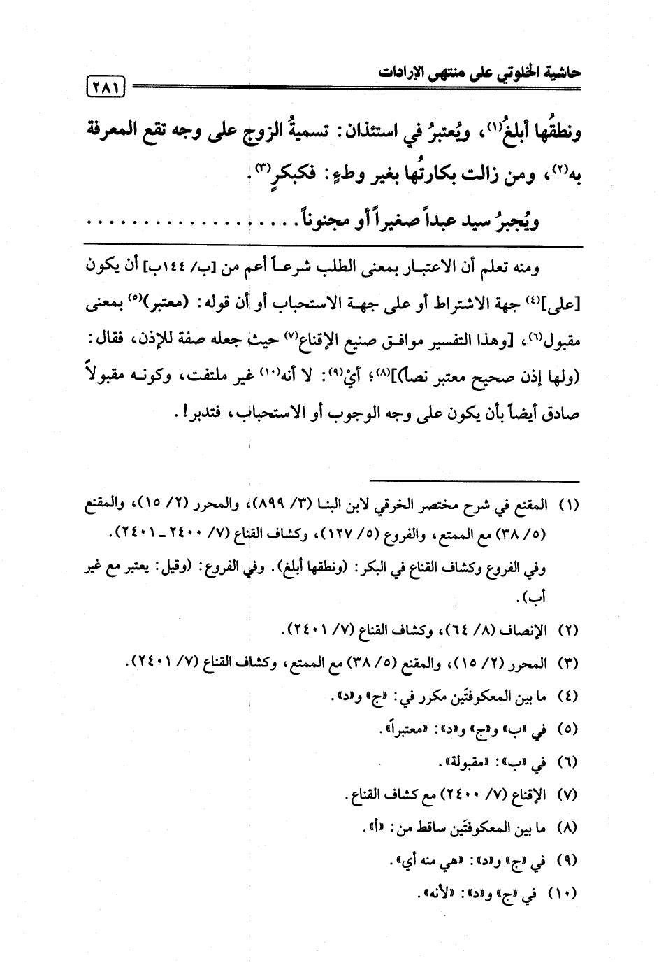 ومنه تعلم أن الاعتبار بمعنى الطلب شرعًا أعم من أن يكون [على] (¬4) جهة الاشتراط أو على جهة الاستحباب أو أن قوله: (معتبر) (¬5) بمعنى مقبول (¬6)، [وهذا التفسير موافق صنيع الإقناع (¬7) حيث جعله صفة للإذن، فقال: (ولها إذن صحيح معتبر نصًا)] (¬8)؛ أيْ (¬9): لا أنه (¬10) غير ملتفت، وكونه مقبولًا صادق أيضًا بأن يكون على وجه الوجوب أو الاستحباب، فتدبر!.