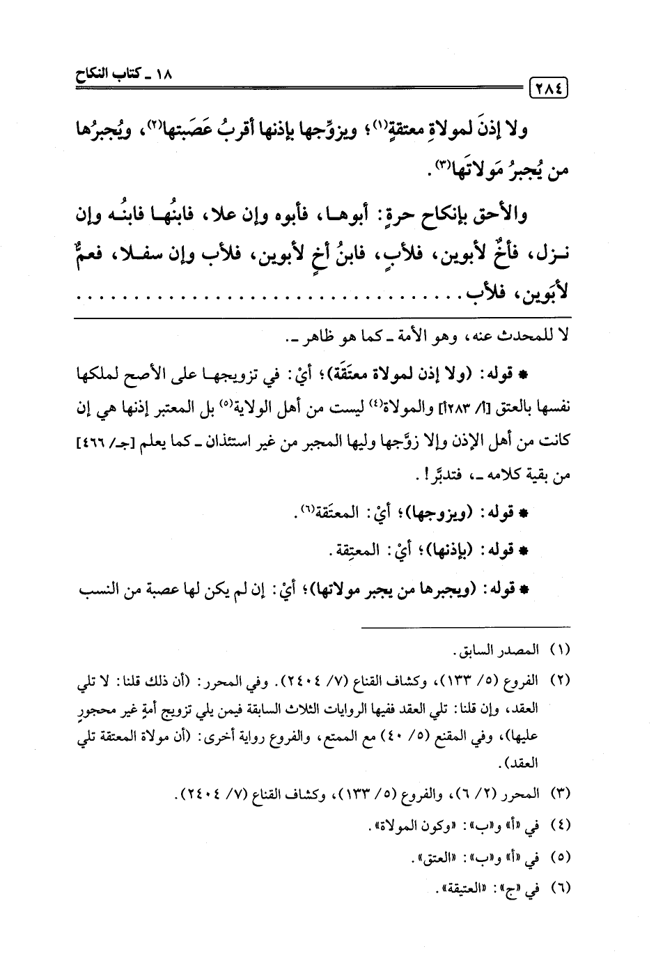 (¬2) الفروع (5/ 133)، وكشاف القناع (7/ 2404). وفي المحرر: (أن ذلك قلنا: لا تلي العقد، وإن قلنا: تلي العقد ففيها الروايات الثلاث السابقة فيمن يلي تزويج أمةٍ غير محجورٍ عليها)، وفي المقنع (5/ 40) مع الممتع، والفروع رواية أخري: (أن مولاة المعتقة تلي العقد).
