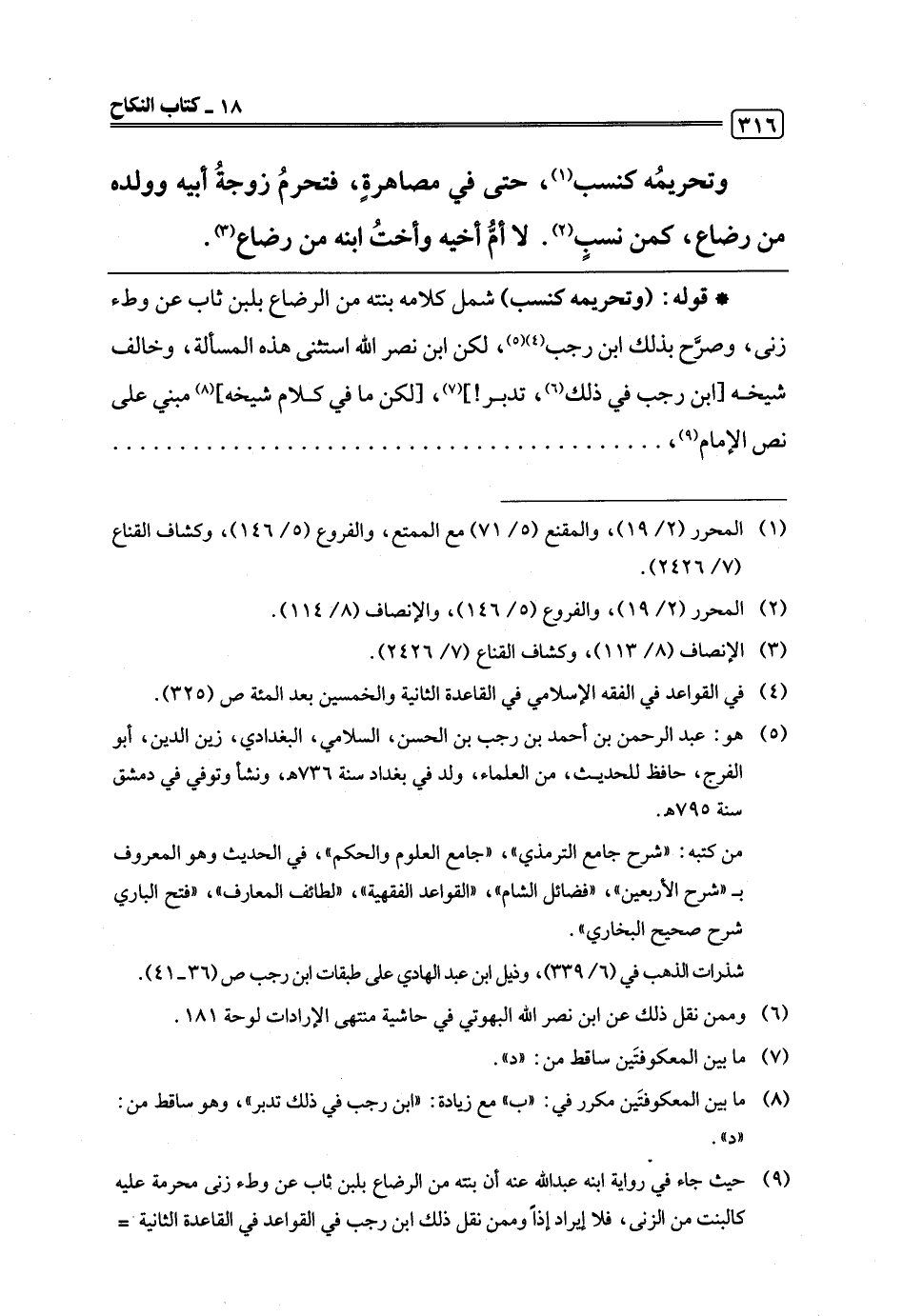 * قوله: (وتحريمه كنسب) شمل كلامه بنته من الرضاع بلبن ثاب عن وطء زنى، وصرَّح بذلك ابن رجب (¬4) (¬5)، لكن ابن نصر اللَّه استثنى هذه المسألة، وخالف شيخه [ابن رجب في ذلك (¬6)، تدبر!] (¬7)، [لكن ما في كلام شيخه] (¬8) مبني على نص الإمام (¬9)،. . . . . .