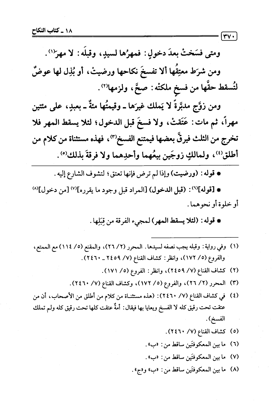 (¬4) في كشاف القناع (7/ 2460): (هذه مستثناة من كلام من أطلق من الأصحاب، أن من عتقت تحت رقيق كله لا الفسخ ويعايا بها فيقال: أمةٌ عتقت كلها تحت رقيق كله ولم تملك الفسخ).