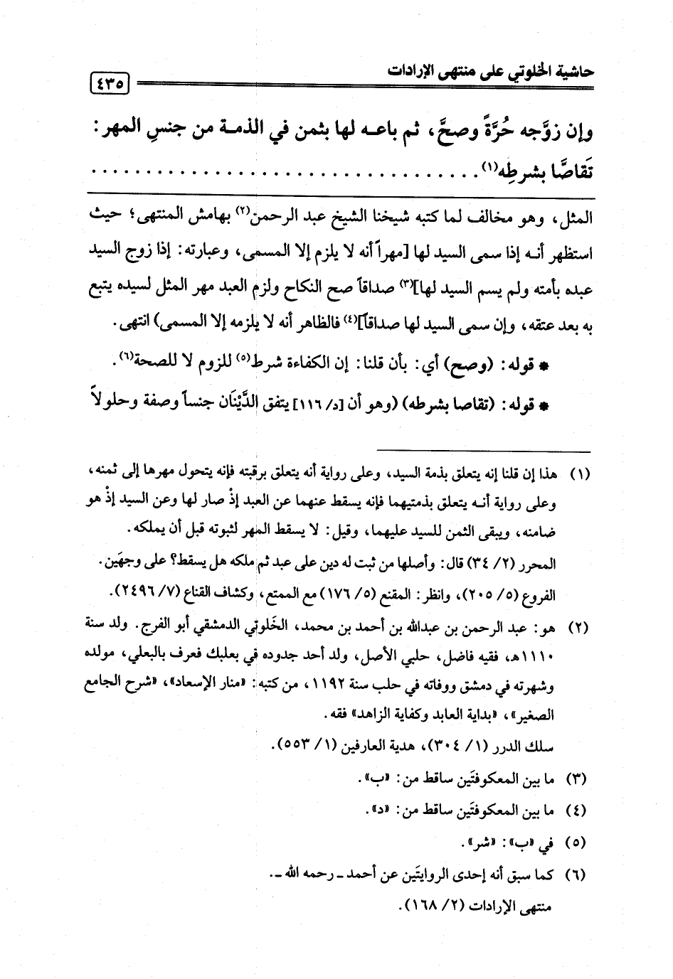 (¬2) هو: عبد الرحمن بن عبد اللَّه بن أحمد بن محمد، الخَلوتي الدمشقي أبو الفرج. ولد سنة 1110 هـ، فقيه فاضل، حلبي الأصل، ولد أحد جدوده في بعلبك فعرف بالبعلي، مولده وشهرته في دمشق ووفاته في حلب سنة 1192، من كتبه: "منار الإسعاد"، "شرح الجامع الصغير"، "بداية العابد وكفاية الزاهد" فقه.