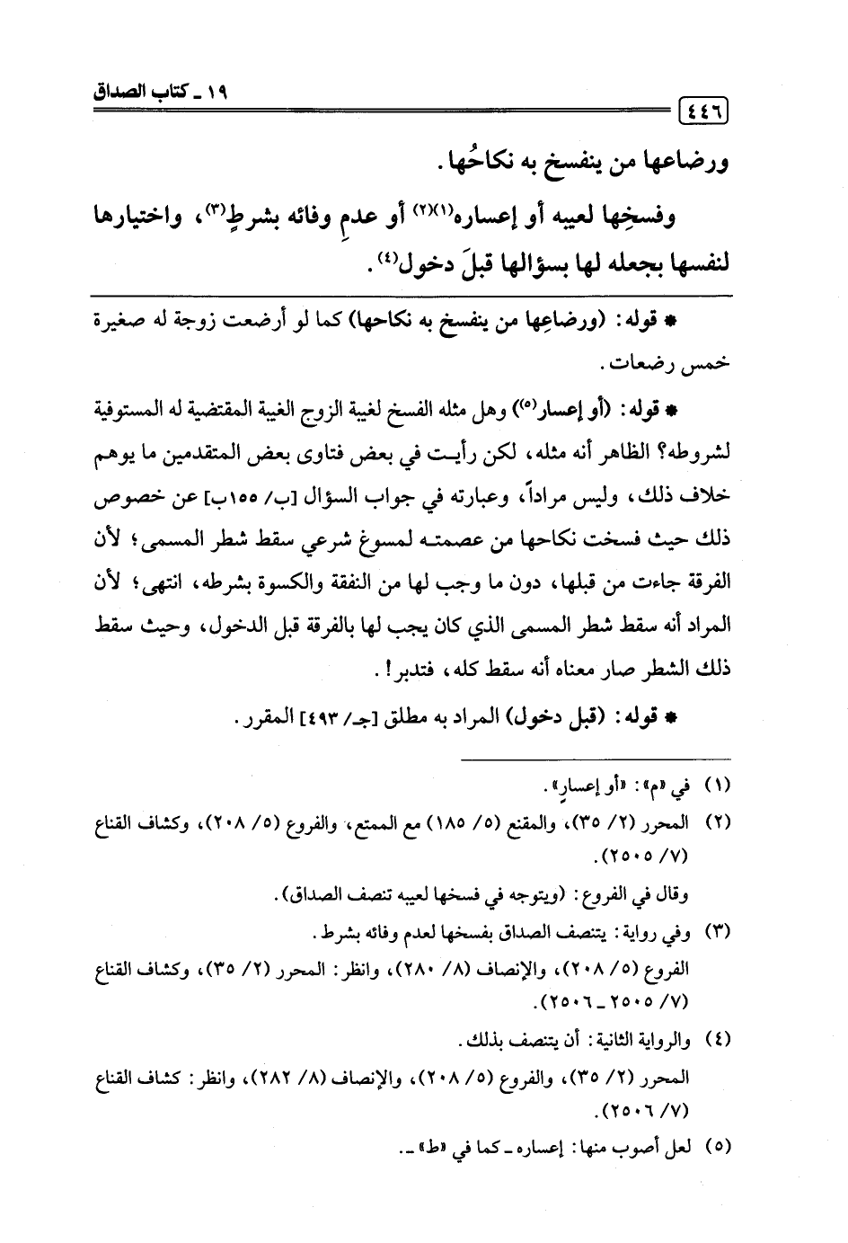 * قوله: (أو إعسار) (¬5) وهل مثله الفسخ لغيبة الزوج الغيبة المقتضية له المستوفية لشروطه؟ الظاهر أنه مثله، لكن رأيت في بعض فتاوى بعض المتقدمين ما يوهم خلاف ذلك، وليس مرادًا، وعبارته في جواب السؤال عن خصوص ذلك حيث فسخت نكاحها من عصمته لمسوغ شرعي سقط شطر المسمى؛ لأن الفرقة جاءت من قبلها، دون ما وجب لها من النفقة والكسوة بشرطه، انتهى؛ لأن المراد أنه سقط شطر المسمى الذي كان يجب لها بالفرقة قبل الدخول، وحيث سقط ذلك الشطر صار معناه أنه سقط كله، فتدبر!.