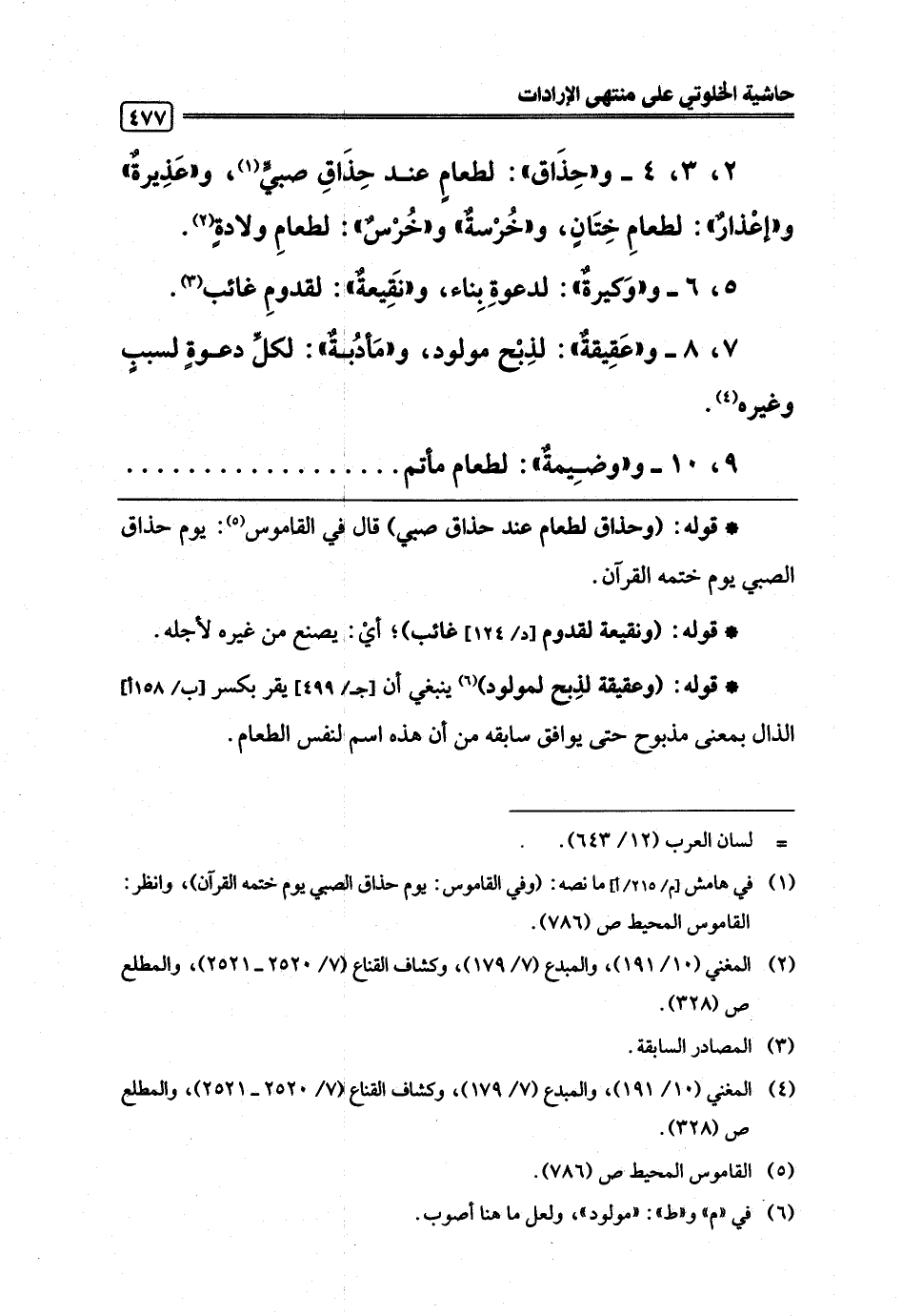 7، 8 - و"عَقِيقةٌ": لذِبْح مولود، و"مَأدُبةٌ": لكلِّ دعوةٍ لسببٍ وغيره (¬4).