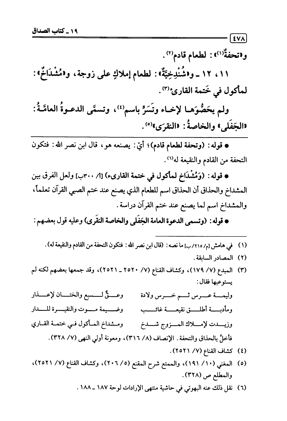 11، 12 - و"شُنْدِخِيَّةٌ": لطعام إملاكٍ على زوجة، و"مُشْدَاخٌ": لمأكول في خَتمة القارئ (¬3).