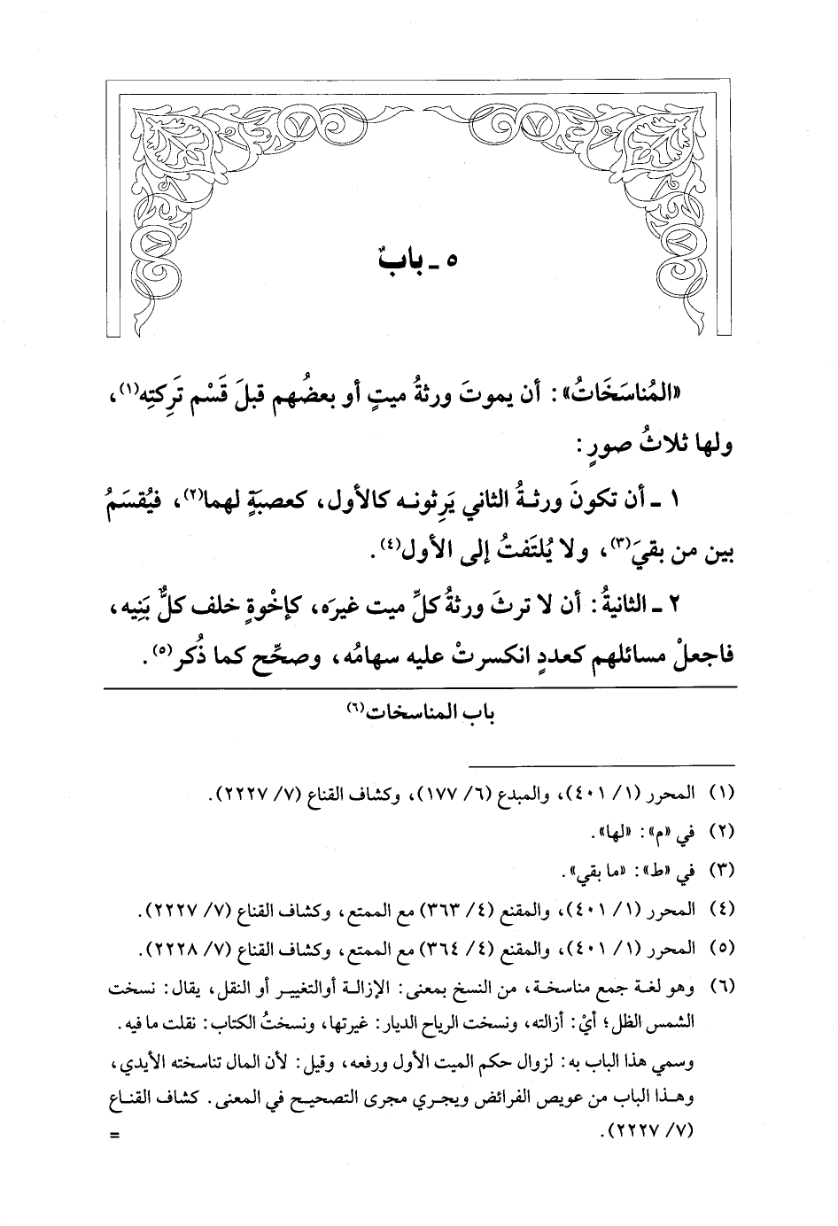 (¬6) وهو لغة جمع مناسخة، من النسخ بمعنى: الإزالة أو التغيير أو النقل، يقال: نسخت الشمس الظل؛ أيْ: أزالته، ونسخت الرياح الديار: غيرتها، ونسختُ الكتاب: نقلت ما فيه.