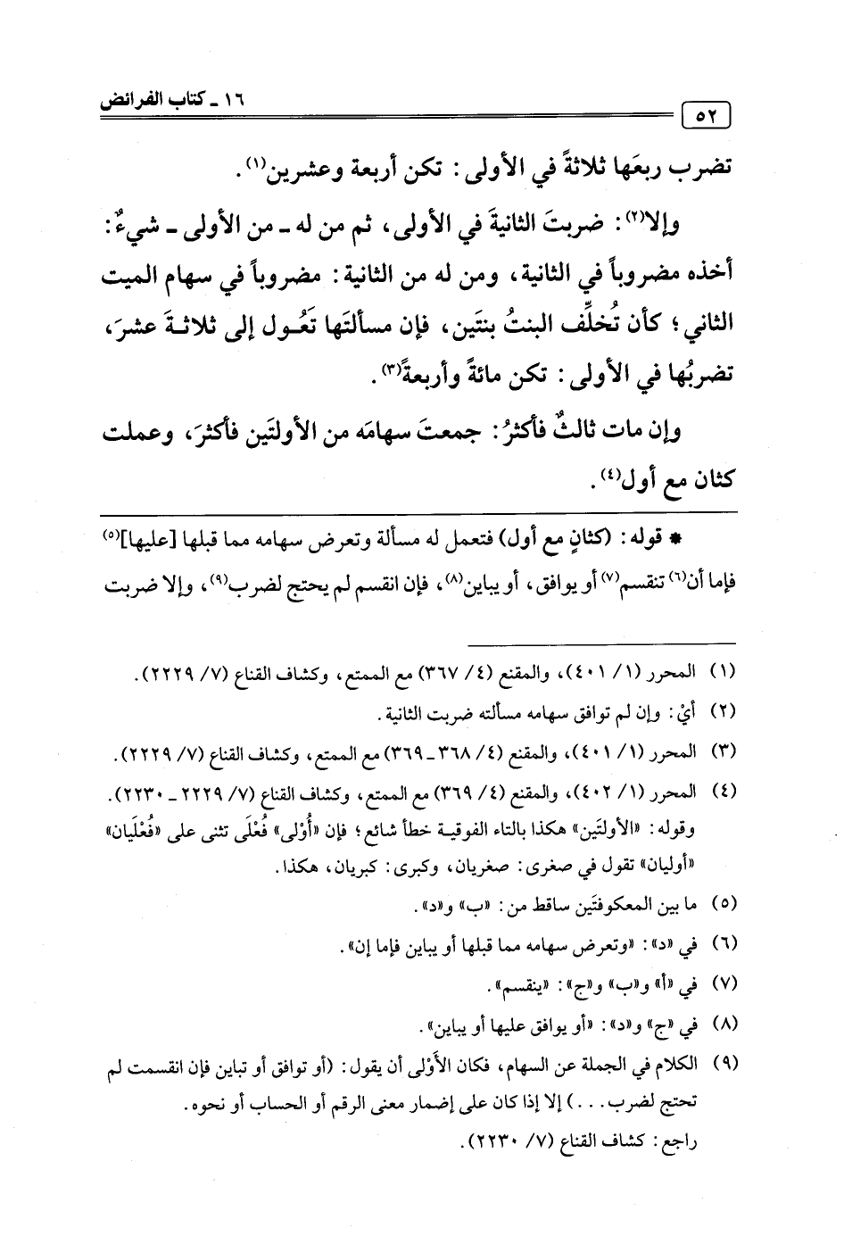 (¬4) المحرر (1/ 402)، والمقنع (4/ 369) مع الممتع، وكشاف القناع (7/ 2229 - 2230). وقوله: "الأولتَين" هكذا بالتاء الفوقية خطأ شائع؛ فإن "أُوْلى" فُعْلَى ثثنى على "فُعْلَيان" "أوليان" تقول في صغرى: صغريان، وكبرى: كبريان، هكذا.