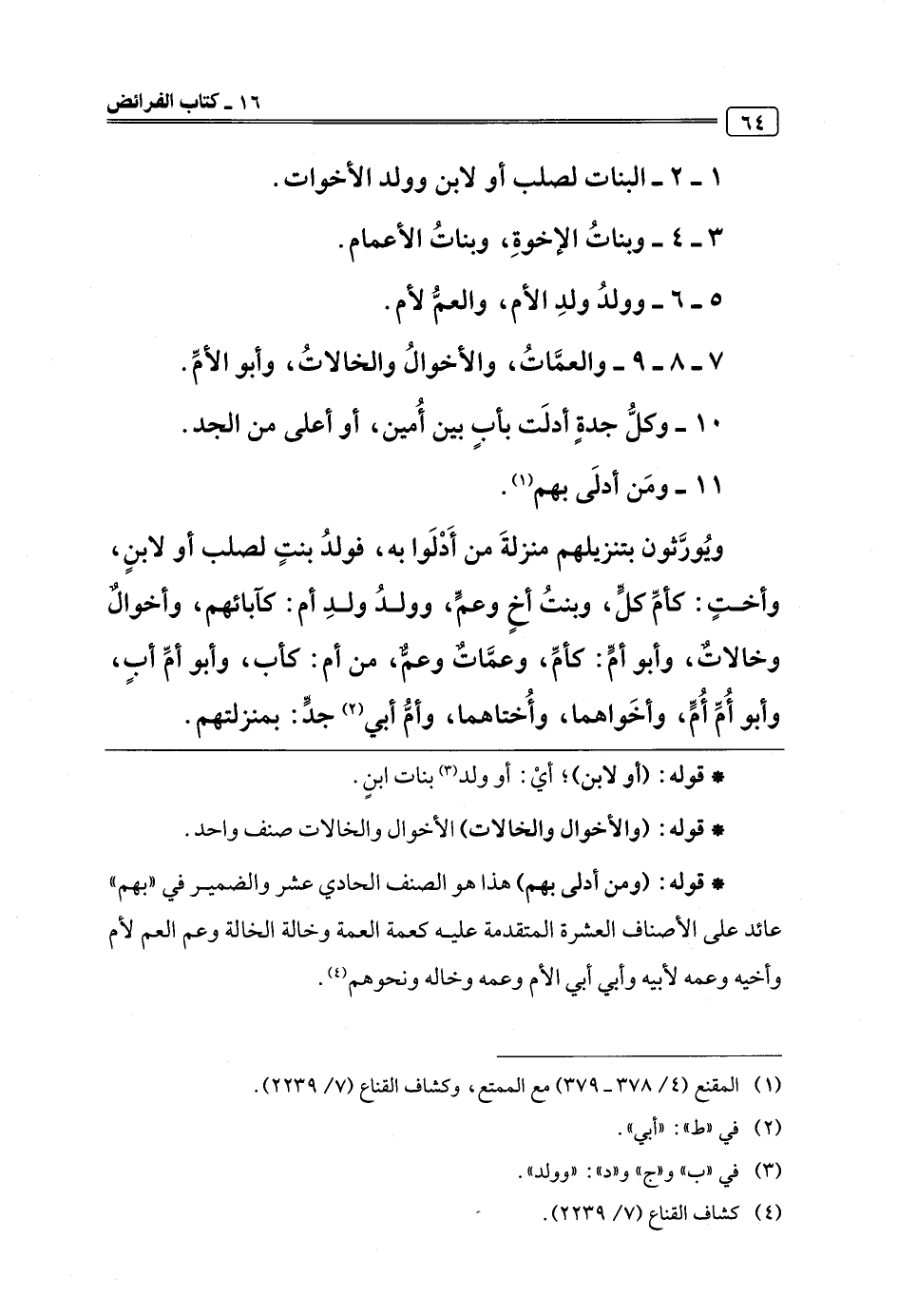 * قوله: (ومن أدلى بهم) هذا هو الصنف الحادي عشر والضمير في "بهم" عائد على الأصناف العشرة المتقدمة عليه كعمة العمة وخالة الخالة وعم العم لأم وأخيه وعمه لأبيه وأبي أبي الأم وعمه وخاله ونحوهم (¬4).
