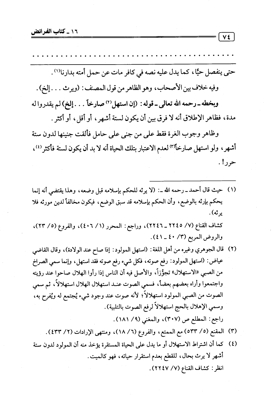 وبخطه -رحمه اللَّه تعالى- قوله: (إن استهل (¬2) صارخًا. . . إلخ) لم يقدروا له مدة، فظاهر الإطلاق أنه لا فرق بين أن يكون لستة أشهر، أو أقل، أو أكثر.