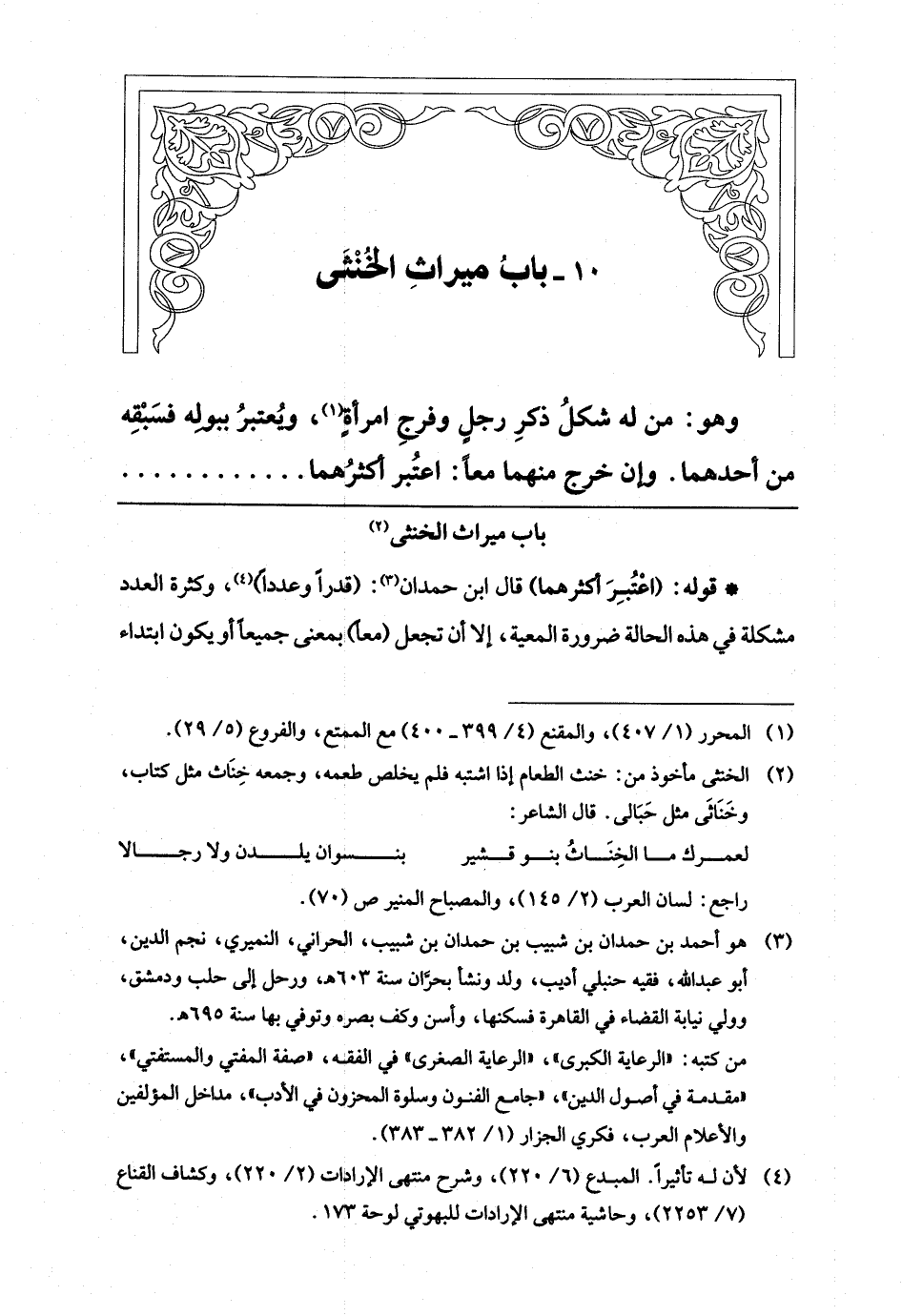 (¬3) هو أحمد بن حمدان بن شبيب بن حمدان بن شبيب، الحراني، النميري، نجم الدين، أبو عبد اللَّه، فقيه حنبلي أديب، ولد ونشا بحرَّان سنة 603 هـ، ورحل إلى حلب ودمشق، وولي نيابة القضاء في القاهرة فسكنها، وأسن وكف بصره وتوفي بها سنة 695 هـ.