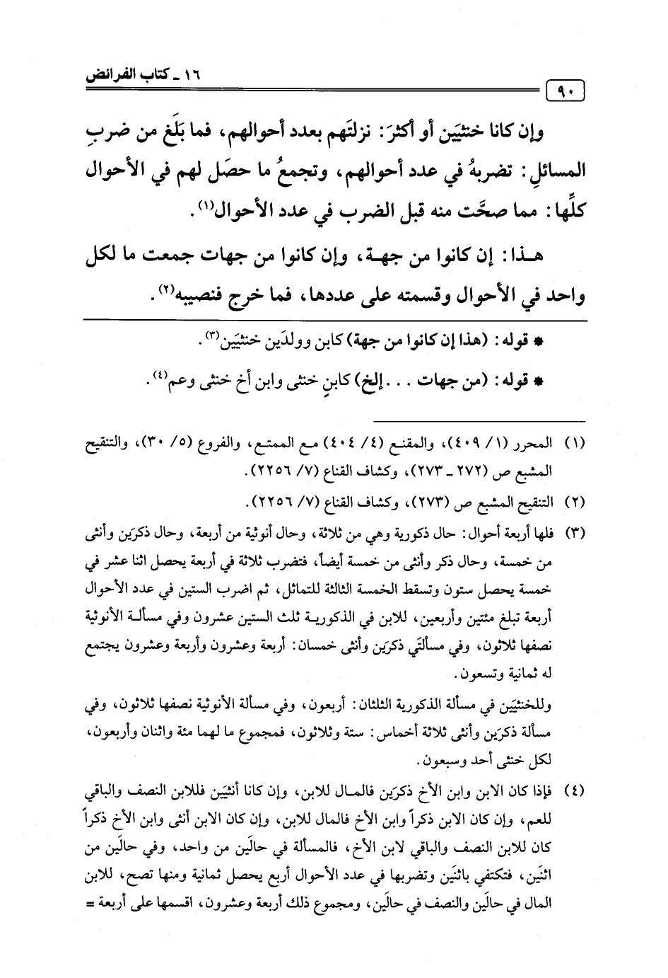(¬3) فلها أربعة أحوال: حال ذكورية وهي من ثلاثة، وحال أنوثية من أربعة، وحال ذكرَين وأنثى من خمسة، وحال ذكر وأنثى من خمسة أيضًا، فتضرب ثلاثة في أربعة يحصل اثنا عشر في خمسة يحصل ستون وتسقط الخمسة الثالثة للتماثل، ثم اضرب الستين في عدد الأحوال أربعة تبلغ مئتين وأربعين، للابن في الذكورية ثلث الستين عشرون وفي مسألة الأنوثية نصفها ثلاثون، وفي مسألتَي ذكرَين وأنثى خمسان: أربعة وعشرون وأربعة وعشرون يجتمع له ثمانية وتسعون.