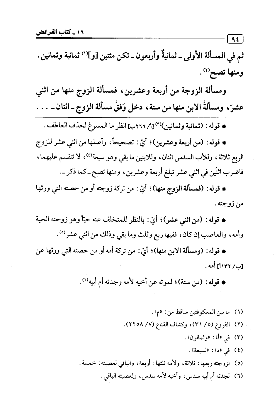 ومسألة الزوجة من أربعة وعشرين، فمسألة الزوج منها من اثني عشرَ، ومسألةُ الابن منها من ستة، دخل وَفقُ مسألة الزوج -اثنان-. . . . . . .