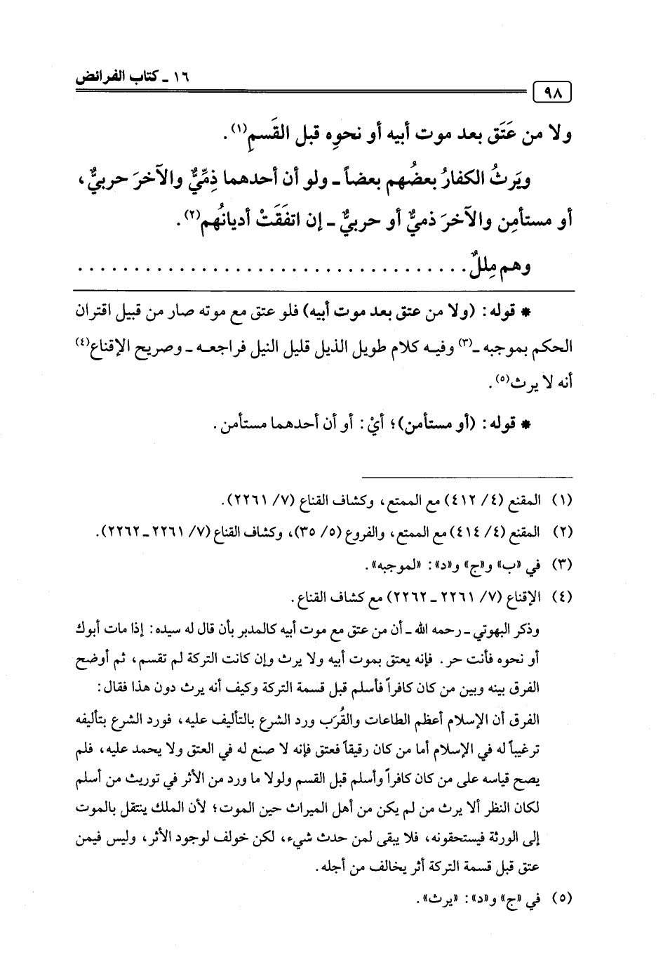 * قوله: (ولا من عتق بعد موت أبيه) فلو عتق مع موته صار من قبيل اقتران الحكم بموجبه - (¬3) وفيه كلام طويل الذيل قليل النيل فراجعه- وصريح الإقناع (¬4) أنه لا يرث (¬5).