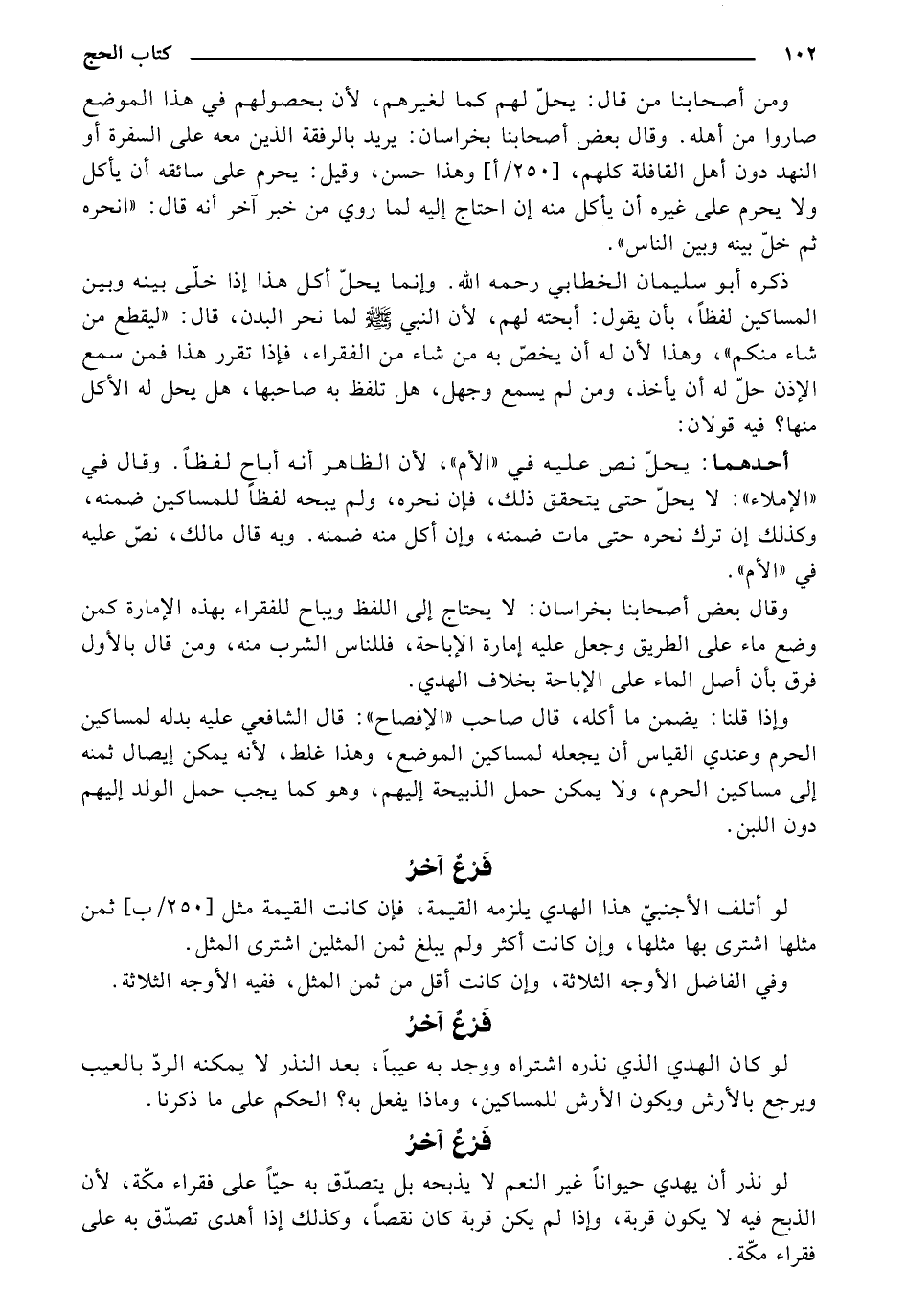 ومن أصحابنا من قال: يحلّ لهم كما لغيرهم، لأن بحصولهم في هذا الموضع صاروا من أهله. وقال بعض أصحابنا بخراسان: يريد بالرفقة الذين معه على السفرة أو النهد دون أهل القافلة كلهم، [250/أ] وهذا حسن، وقيل: يحرم على سائقه أن يأكل ولا يحرم على غيره أن يأكل منه إن احتاج إليه لما روي من خبر أخر أنه قال: "انحره ثم خلّ بينه وبين الناس".