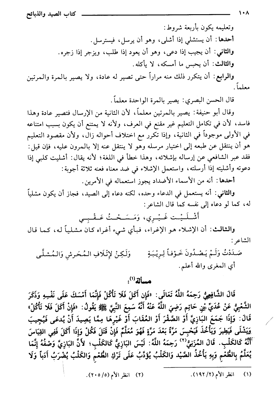 قالُ الشّافِعيِ رحمهُ اللهُ تََعَالَى: "فإنّ أكُلّ فلا تأكّل فإنّما أمُسُك على نفسُه وذكر الشُّعبيِ عن عُدّيِ بُنِّ حاتم رضيَ اللهُ عنه أنّه سمِع النّبيّ - صلى الله عليه وسلم - يقول: "فإنّ أكُلّ فلا تأكّل" قَالَ: وإذاً جمع البازيِ أوْ الصّقر أوْ العِقاب أوْ غيْرها مِمّا يصيدُ أن يدّعيَ فيَجيبُ ويشلى فيَطيرُ ويَأخُذُ فيُحبِسُ مرّةً بعد مرّةً فهوَ معلم فإنّ قتل فكُلّ وإذاً أكُلّ ففي القياس أنّه كالكلِبِ. قال المُزَنيُّ رحمهُ اللهُ: ليْس البازيِ كالكلِبِ؛ لأنَّ البازيَِّ وصفّهُ إنّما يُعلِمُ بِالطُّعمِ وبِهِ يأخُذُ الصّيْدُ والكلِبُ يُؤدِّبُ على تركِ الطُّعمِ والكلِبُ يُضرِبُ أدُبا ولا