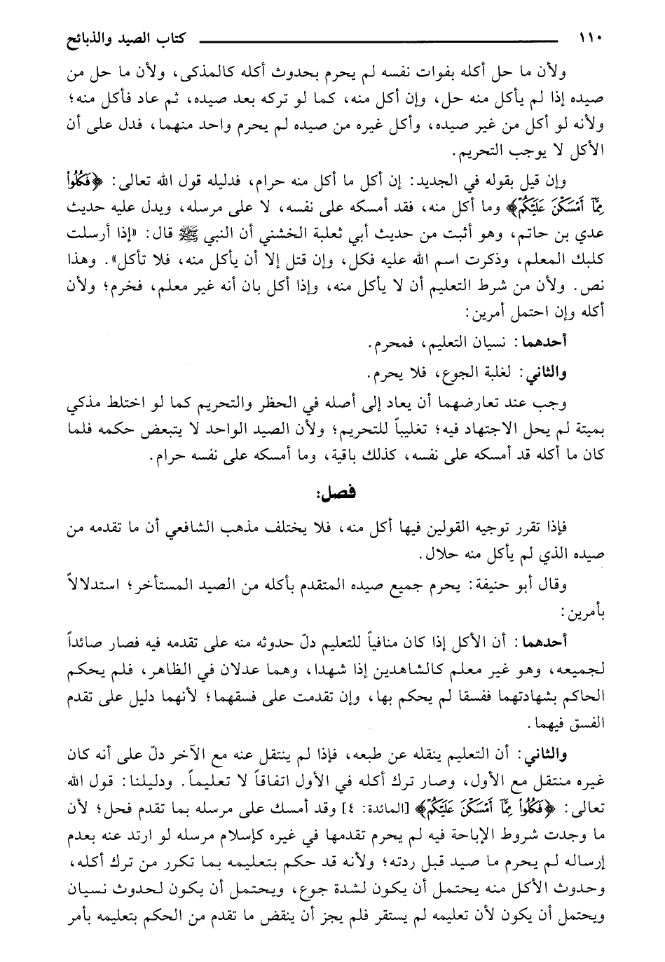 وجب عند تعارضهما أن يعاد إلى أصله في الحظر والتحريم كما لو اختلط مذكي بميتة لم يحل الاجتهاد فيه؛ تغليباً للتحريم؛ ولأن الصيد الواحد لا يتبعض حكمه فلما كان ما أكله قد أمسكه على نفسه، كذلك باقية، وما أمسكه على نفسه حرام.