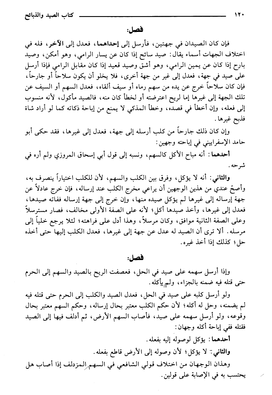 فإن كان الصيدان في جهتين، فأرسل إلى إحداهما، فعل ل إلى الآخر، فله في اختلاف الجهات أسماء يقال: صيد سائح إذا كان عن يسار الرامي، وهو أمكن، وصيد بارح إذا كان عن يمين الرامي، وهو أشق وصيد قعيد إذا كان مقابل الرامي فإذا أرسل على صيد في جهة، فعدل إلى غير من جهة أخرى، فلا يخلو أن يكون سلاحاً أو جارحاً، فإن كان سلاحاً خرج عن يده من سهم رماه أو سيف ألقاه، فعدل السهم أو السيف عن تلك الجهة إلى غيرها إما لريح اعترضته أو لخطأ كان منه، فالصيد مأكول، لأنه منسوب إلى فعله، وإن أخطأ في قصده، وخطأ المذكي لا يمنع من إباحة ذكاته كما لو أراد شاة فذبح غيرها.