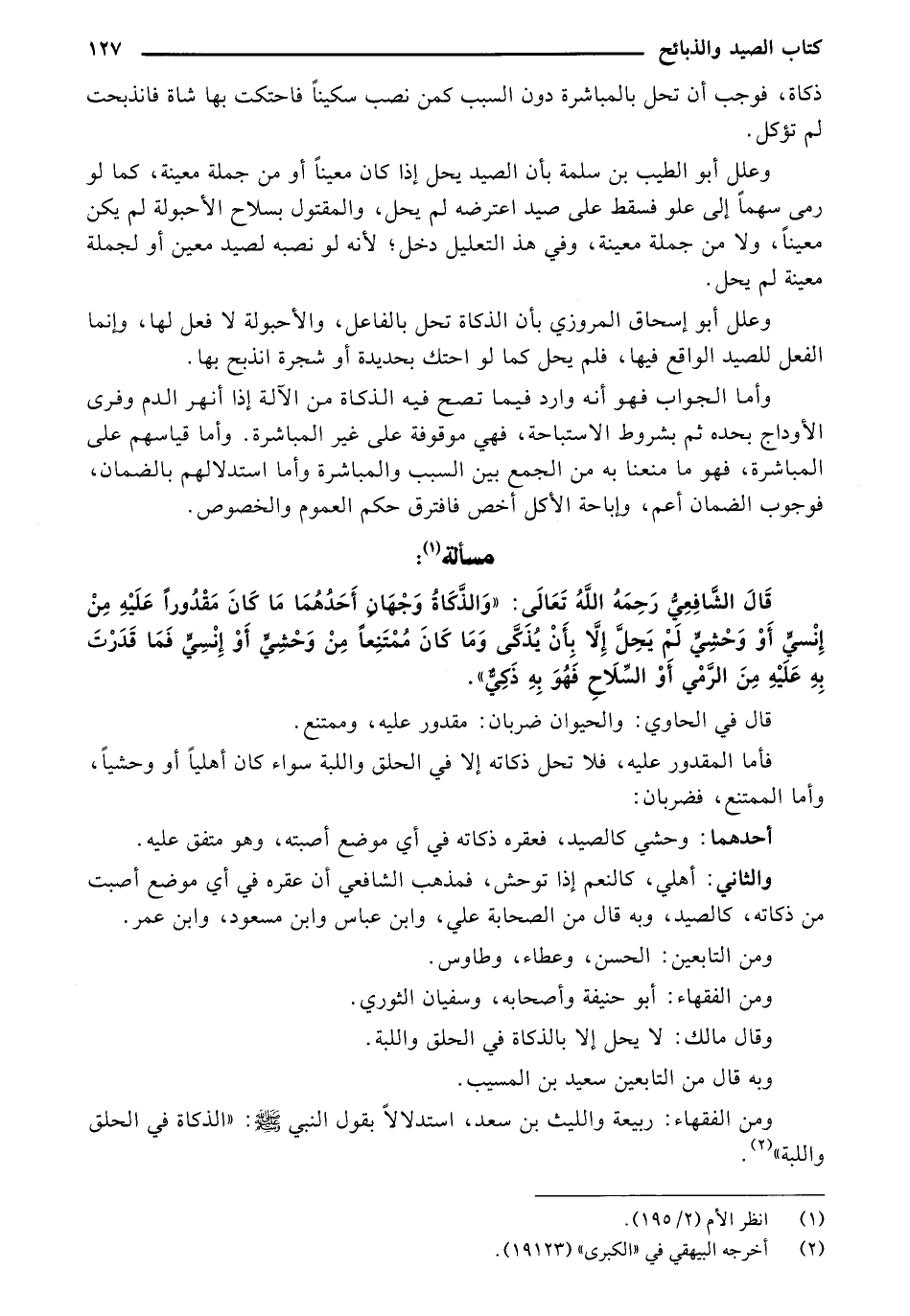 قالُ الشّافِعيِ رحمهُ اللهُ تعالى: " والذّكاة وجهانِ أحدّهُما ما كان مقدورا عليه مِن إنسي أوْ وحشي لم يحِل إلّا بِأن يذكى وما كان مُمتنِعا مِن وحشي أوْ إنسي فما قدّرت بِهِ عليه مِن الرّمي أوْ السِّلاح فهوَ بِهِ ذكيّ".