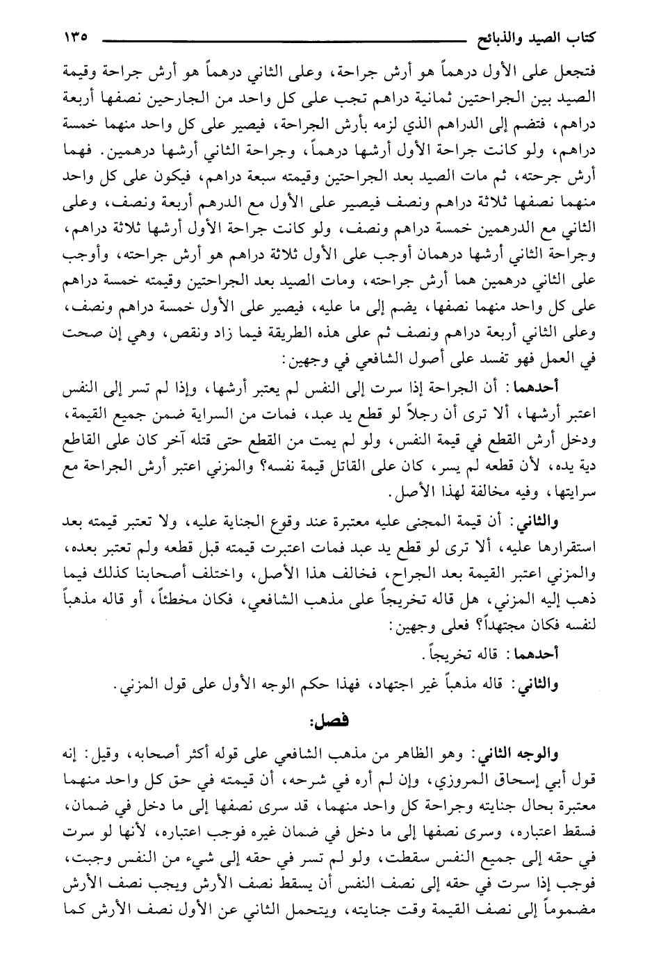 فتجعل على الأول درهماً هو أرش جراحة، وعلى الثاني درهماً هو أرش جراحه وقيمة الصيد بين الجراحتين ثمانية دراهم تجب على كل واحد من الجارحين نصفها أربعة دراهم، فتضم إلى الدراهم الذي لزمه بأرش الجراحة، فيصير على كل واحد منهما خمسة دراهم، ولو كانت جراحة الأول أرشها درهماً، وجراحة الثاني أرشها درهمين. فهما أرش جرحته، ثم مات الصيد بعد الجراحتين وقيمته سبعة دراهم، فيكون على كل واحد منهما نصفها ثلاثة دراهم ونصف فيصير على الأول مع الدرهم أربعة ونصف، وعلى الثاني مع الدرهمين خمسة دراهم ونصف، ولو كانت جراحة الأول أرشها ثلاثة دراهم، وجراحة الثاني أرشها درهمان أوجب على الأول ثلاثة دراهم هو أرش جراحته، وأوجب على الثاني درهمين هما أرش جراحته، ومات الصيد بعد الجراحتين وقيمته خمسة دراهم على كل واحد منهما نصفها، يضم إلى ما عليه، فيصير على الأول خمسة دراهم ونصف، وعلى الثاني أربعة دراهم ونصف ثم على هذه الطريقة فيما زاد ونقص، وهي إن صحت في العمل فهو تفسد على أصول الشافعي في وجهين: