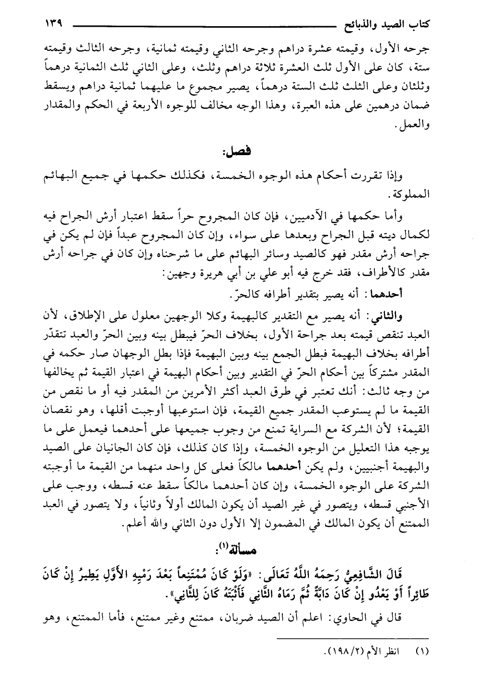 والثاني: أنه يصير مع التقدير كالبهيمة وكلا الوجهين معلول على الإطلاق، لأن العبد تنقص قيمته بعد جراحة الأول، بخلاف الحرّ فيبطل بينه وبين الحرّ والعبد تتقدر أطرافه بخلاف البهيمة فبطل الجمع بينه وبين البهيمة فإذا بطل الوجهان صار حكمه في المقدر مشتركاً بين أحكام الحرّ في التقدير وبين أحكام البهيمة في اعتبار القيمة ثم يخالفها من وجه ثالث: أنك تعتبر في طرق العبد أكثر الأمرين من المقدر فيه أو ما نقص من القيمة ما لم يستوعب المقدر جميع القيمة، فإن استوعبها أوجبت أقلها، وهو نقصان القيمة؛ لأن الشركة مع السراية تمنع من وجوب جميعها على أحدهما فيعمل على ما يوجبه هذا التعليل من الوجوه الخمسة، وإذا كان كذلك، فإن كان الجانيان على الصيد والبهيمة أجنبيين، ولم يكن أحدهما مالكاً فعلى كل واحد منهما من القيمة ما أوجبته الشركة على الوجوه الخمسة، وإن كان أحدهما مالكاً سقط عنه قسطه، ووجب على الأجنبي قسطه، ويتصور في غير الصيد أن يكون المالك أولاً وثانياً، ولا يتصور في العبه الممتنع أن يكون المالك في المضمون إلا الأول دون الثاني والله أعلم.