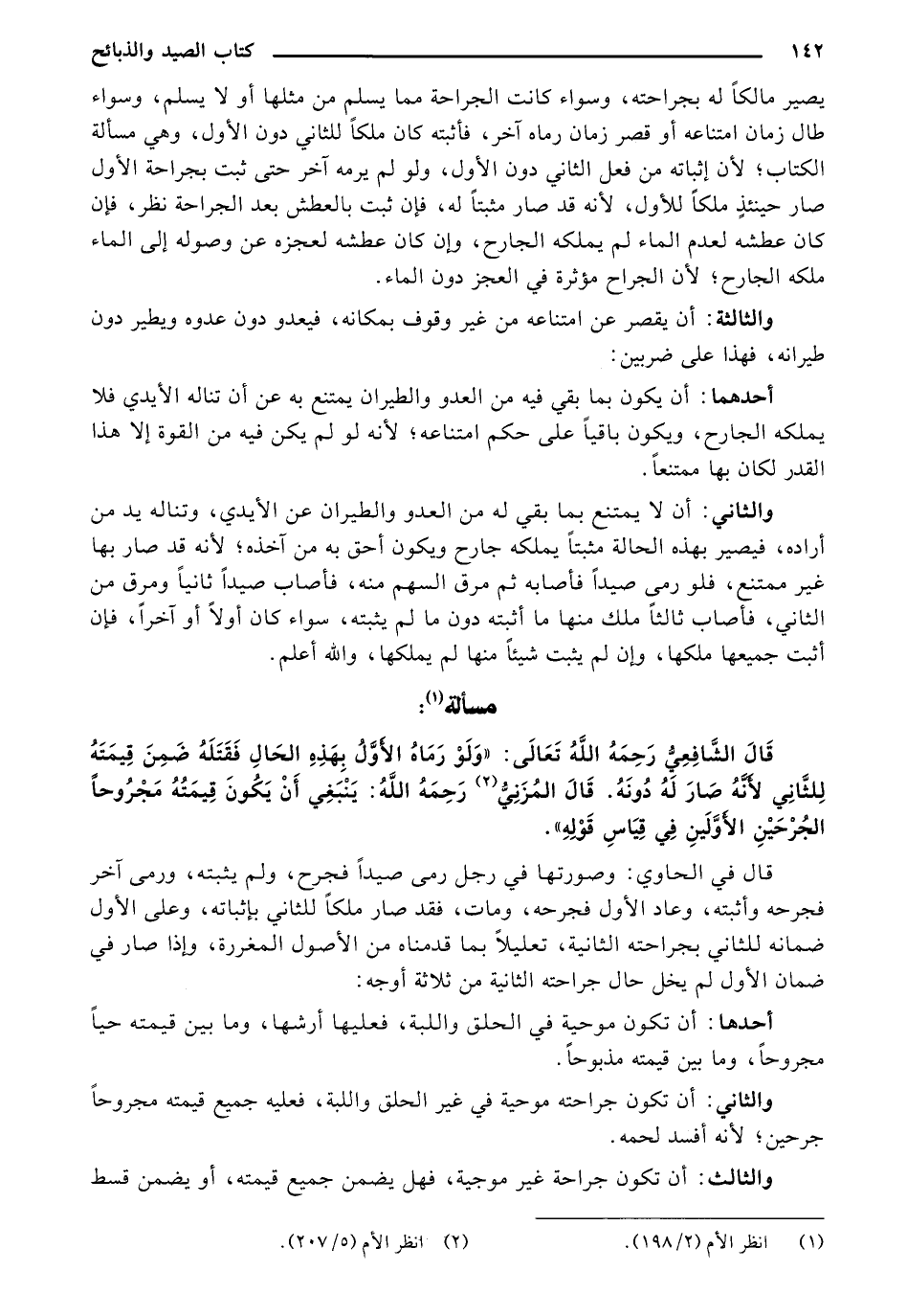 قالُ الشّافِعيِ رحمهُ اللهُ تعالى:" ولوْ رمّاهُ الأول بِهذِهِ الحال فقتلهُ ضِمن قيَمتُهُ لِلثاني لِأنّه صار لهُ دونهُ. قالُ اِلمِزِنّي رحمهُ اللهُ: ينبغي أن يُكوِّن قيَمتُهُ مجروحا الجُرحيْنِ الأولين في قياسِ قوْلِهُ".