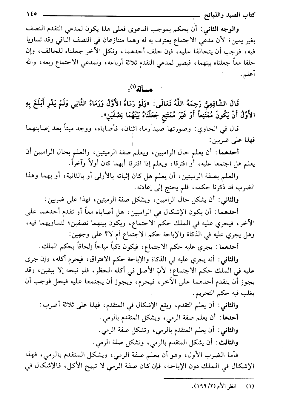 قالُ الشّافِعيِ رحمهُ اللهُ تعالى:" ولوْ رمّاهُ الأول ورّماهُ الثّاني ولم يُدِرُّ أبلغ بِهِ الأول أن يُكوِّن مُمتنِعا أوْ غيْر مُمتنِعِ جعلناهُ بيْنهُما نِصفيْنِ".