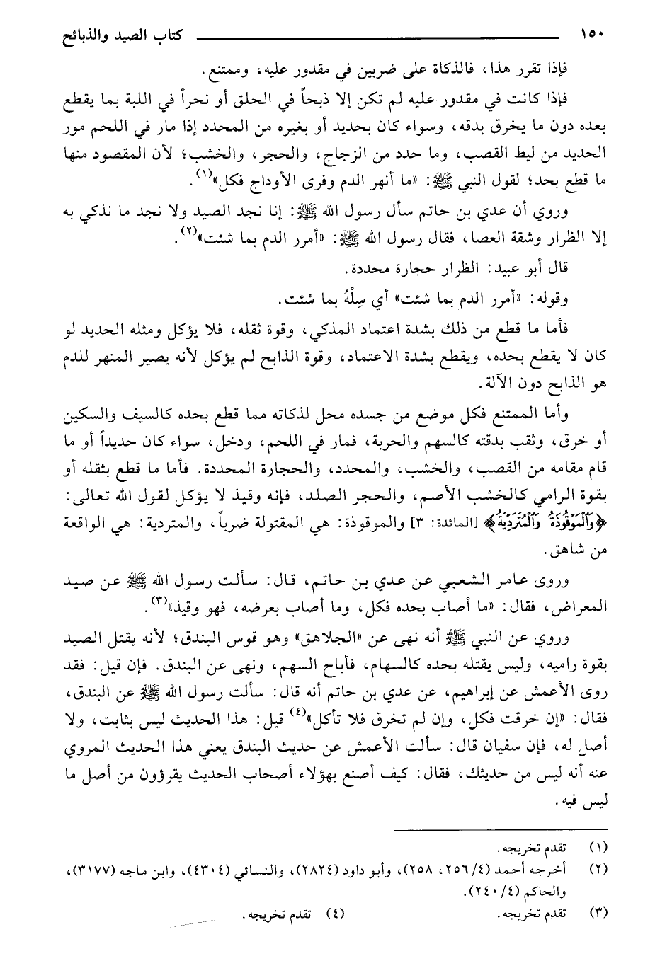 وروى عامر الشعبي عن عدي بن حاتم، قال: سألت رسول الله - صلى الله عليه وسلم - عن صيد المعراض، فقال: "ما أصاب بحده فكل، وما أصاب بعرضه، فهو وقيذ".