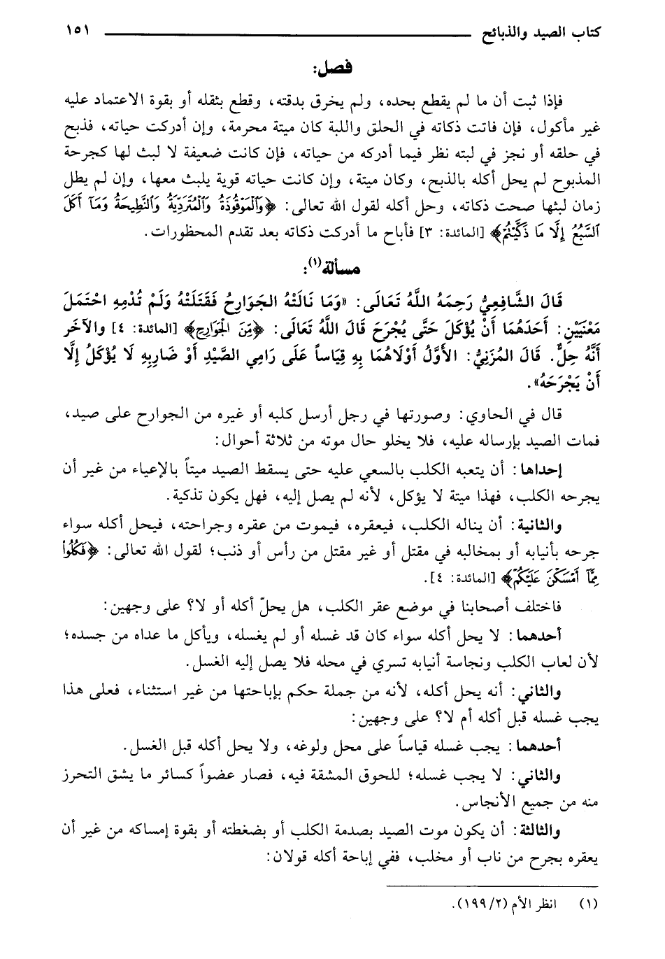 قَالَ الشَّافِعِيِ رحمَهُ اللهَ تَعَالَى: "وَمَا نَالَتْهُ الْجوارحِ فَقِتْلَتَهُ وَلَمْ تَذُمُّهُ اِحْتَمَلَ مَعْنِيَّيْنِ: أَحَدُّهُمَا أَنْ يُؤْكَلَ حَتَّى يَجْرَحَ قَالُ اللهِ تَعَالَى {مِنْ الْجوارح} [الْمَائِدَةَ: 4] والآخر أَنَّه حَلُّ قَالُ اِلْمِزِنَّي: الأول أَوَّلاهُمَا بِهِ قِيَاسَا عَلَى رَامِي الصَّيْدِ أَوْ ضَارِبَهُ لَا يُؤْكَلَ إلّا أَنْ يَجْرَحَه".