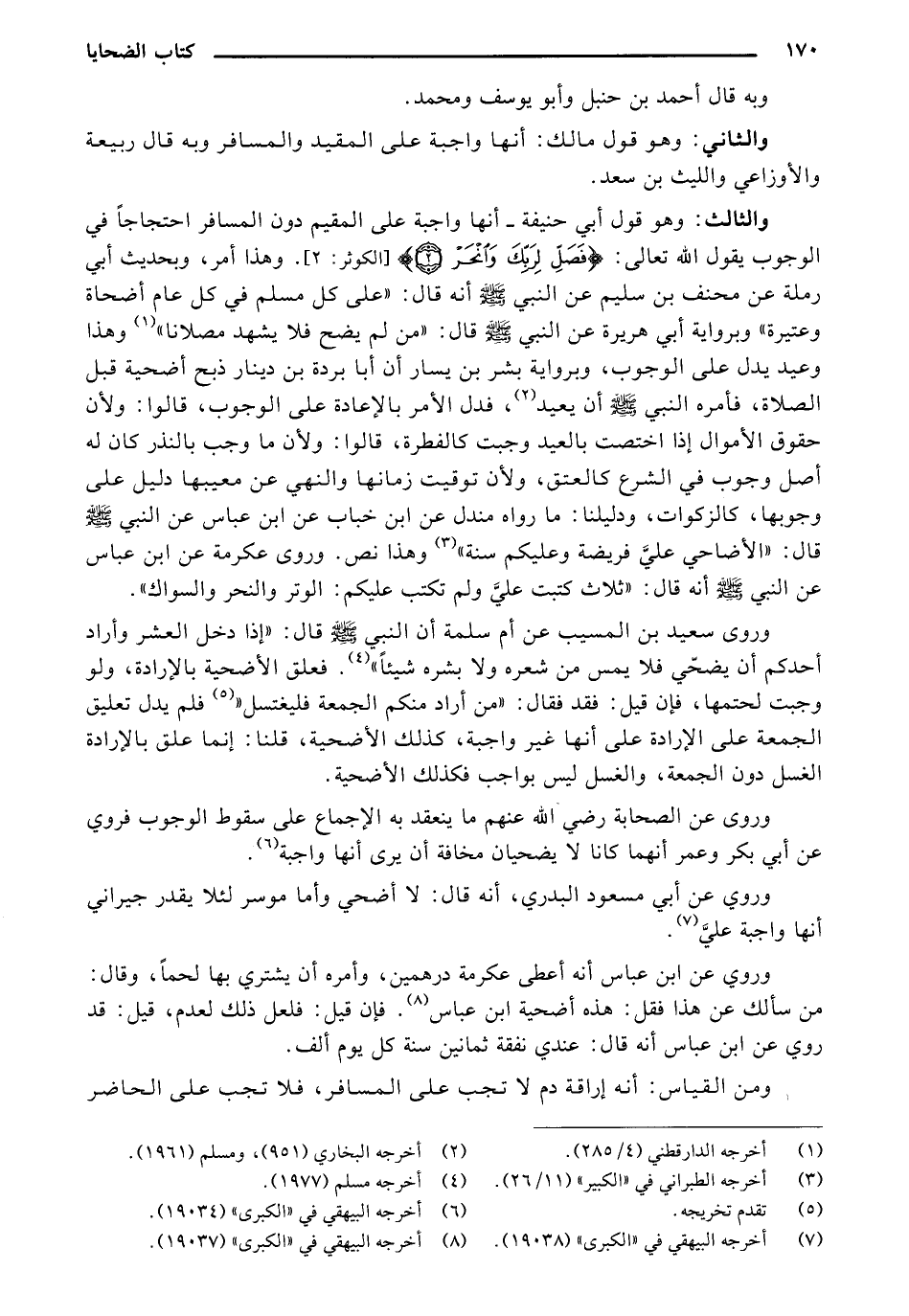 والثالث: وهو قول أبي حنيفة _ أنها واجبة على المقيم دون المسافر احتجاجاً في الوجوب يقول الله تعالى: {فَصَلِّ لِرَبِّكَ وانْحَرْ} [الكوثر: 2]. وهذا أمر، وبحديث أبي رملة عن محنف بن سليم عن النبي - صلى الله عليه وسلم - أنه قال: "على كل مسلم في كل عام أضحاة وعتيرة" وبرواية أبي هريرة عن النبي - صلى الله عليه وسلم - قال: "من لم يضح فلا يشهد مصلانا" وهذا وعيد يدل على الوجوب، وبرواية بشر بن يسار أن أبا بردة بن دينار ذبح أضحية قبل الصلاة، فأمره النبي - صلى الله عليه وسلم - أن يعيد، فدل الأمر بالإعادة على الوجوب، قالوا: ولأن حقوق الأموال إذا اختصت بالعيد وجبت كالفطرة، قالوا: ولأن ما وجب بالنذر كان له أصل وجوب في الشرع كالعتق، ولأن توقيت زمانها والنهي عن معيبها دليل على وجوبها، كالزكوات، ودليلنا: ما رواه مندل عن ابن خباب عن ابن عباس عن النبي - صلى الله عليه وسلم - قال: "الأضاحي علي فريضة وعليكم سنة" وهذا نص. وروى عكرمة عن ابن عباس عن النبي - صلى الله عليه وسلم - أنه قال: "ثلاث كتبت عليَّ ولم تكتب عليكم: الوتر والنحر والسواك".