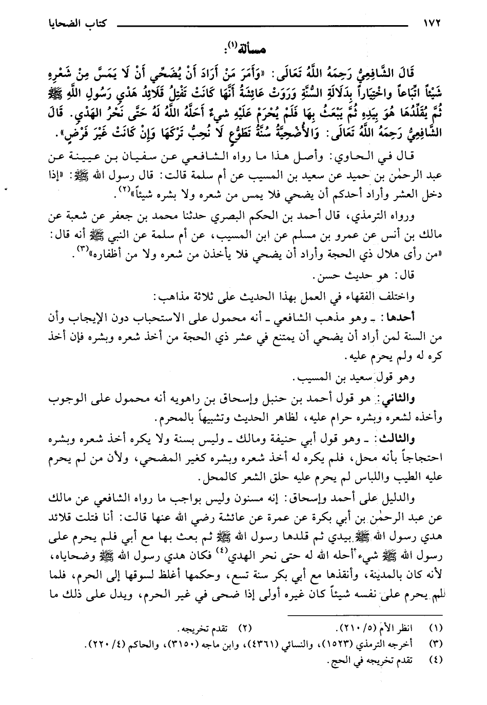 قَالُ الشَّافِعِيِ رحمَهُ اللَّهُ تَعَالَى:" وَأُمِرُّ مِنْ أَرَادَ أَنْ يُضَحِّيَ أَنْ لَا يُمِسُّ مِنْ شَعْرِهُ شِيئَا اتباعاً وَاِخْتِيَارَا بِدَلالِهُ السِّنَّةَ وَرَوَتْ عَائِشَةُ أَنَّهَا كَانَتْ تَفَتُّلُ قَلاَئِدِ هُدى رَسُولِ اللهِ - صلى الله عليه وسلم - ثَمَّ يُقَلِّدُهَا هُوَ بِيدُهُ ثَمَّ يَبْعَثُ بِهَا فَلَمْ يُحْرِمُ عَلَيه شَيْءَ آحله اللهِ لَهُ حَتَّى نَحَرَّ الْهُدى. قَالُ الشَّافِعِيِ رحمَهُ اللَّهُ تَعَالَى: والأضحية سِنَّةً تَطَوُّعِ لَا نَحْبَ تَرْكِهَا وَإِنَّ كَانَتْ غَيْرَ فُرَّضِ"