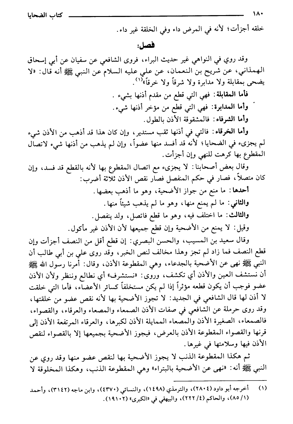 وقد روي في النواهي غير حديث البراء، فروى الشافعي عن سفيان عن أبي إسحاق الهمذاني، عن شريح بن النعمان، عن علي عليه السلام عن النبي - صلى الله عليه وسلم - أنه قال: "لا يضحى بمقابلة ولا مدابرة ولا شرقاً ولا خرقًا"