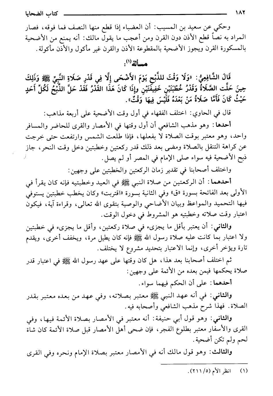 قَالُ الشَّافِعِيِ:"وَلَا وَقَتَّ لِلْذِبْحِ يَوْمَ الْأَضْحَى إلّا فِي قِدْرِ صَلاَةِ النَّبِيِّ وَذَلِكَ حِينَ حَلَتْ الصَّلاَةُ وَقَدْرَ خُطَبَتَيْنِ خُفَيْفَتَيْنِ وَإذاً كَانَ هَذَا الْقِدْرُ فَقَدْ حَلَّ الذِّبْحُ لَكُلَّ أَحَدَّ حَيْثُ كَانَ فَأَمَا صَلاَةَ مِنْ بَعْدَه فَلَيْسَ فِيهَا وَقَتَّ".