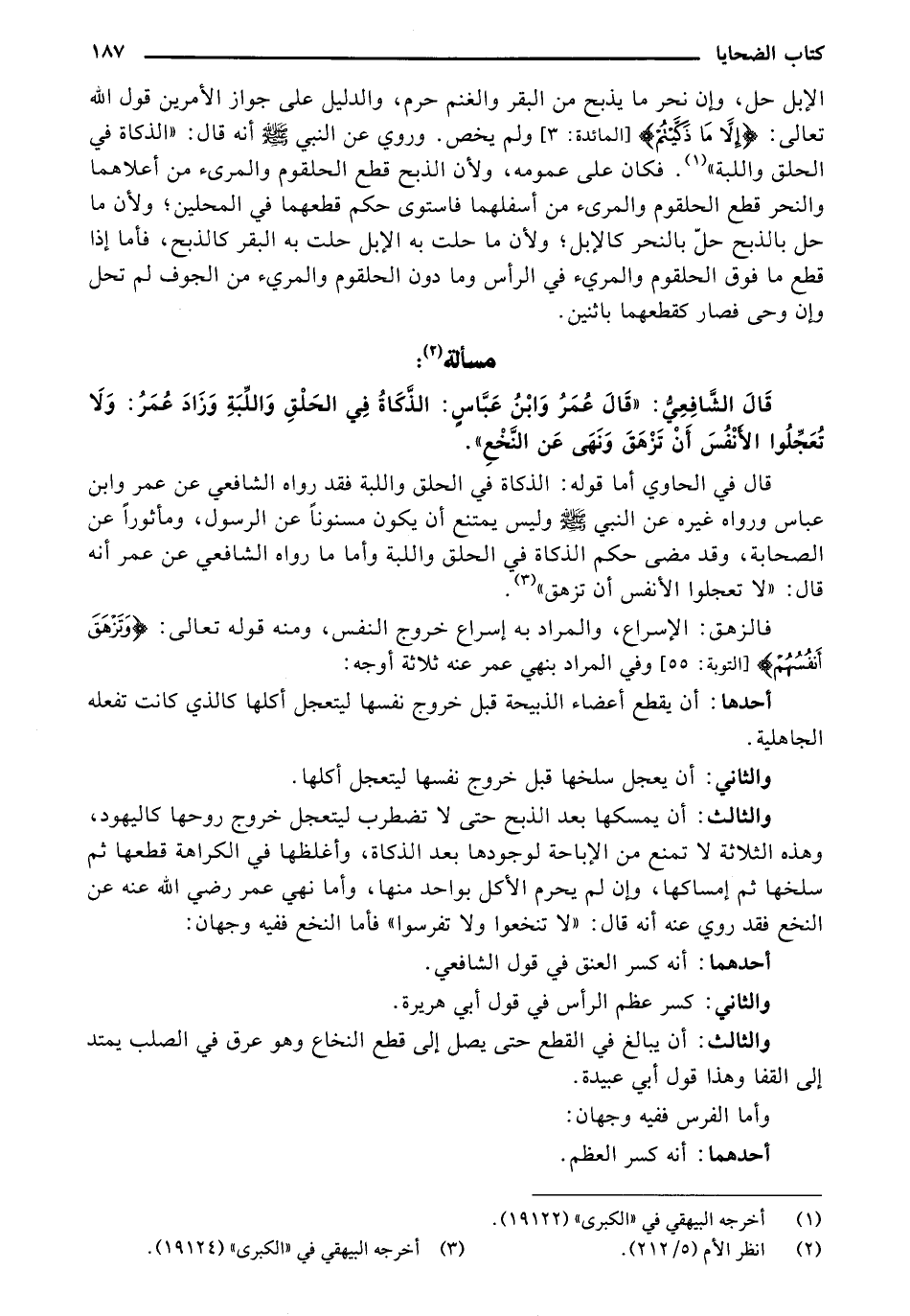 قَالُ الشَّافِعِيِ:" قَالُ عُمَرِ وَاِبْنَ عباسِ: الذكاه فِي الْحلْوِ وَاللَّبَّةِ وَزادَ عُمَرِ: وَلَا تَعَجَّلُوا الأنفس أَنْ تَزْهَقَ وَنُهًى عَنْ النُّخُعِ "