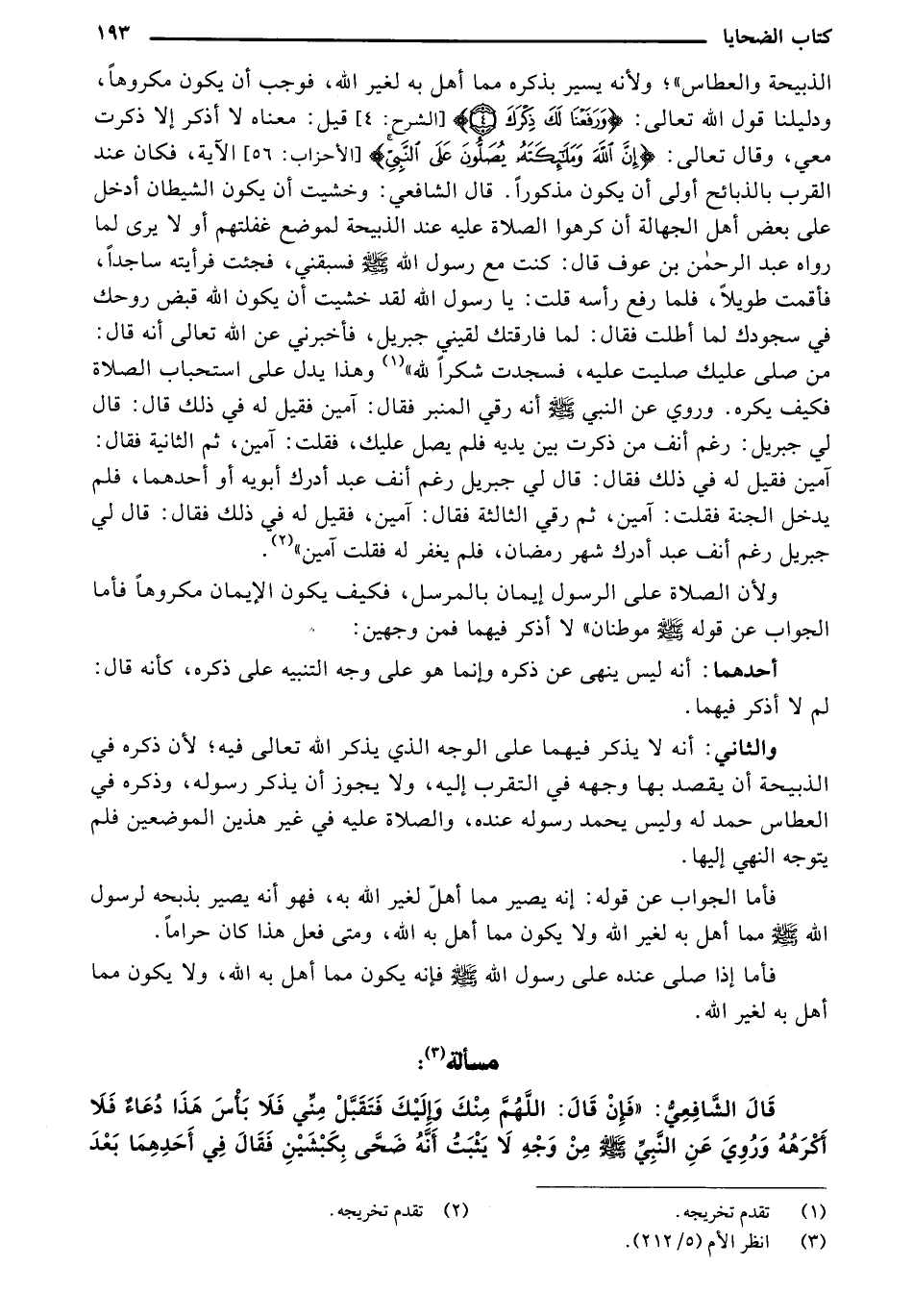 قَالُ الشَّافِعِيِ:" فَإِنَّ قَالُ:" اللَّهُمَّ مِنْكِ وَإِلَيكِ فَتَقَبُّلَ مِنِْي فَلَا بأس هَذَا دُعَاءَ فَلَا أَكَرِهَهُ وَرَوِيَّ عَنْ النَّبِيِّ - صلى الله عليه وسلم - مِنْ وَجْهِ لَا يُثْبِتُ أَنَّه ضُحًى بِكَبْشِينَ فَقَالَ فِي أَحَدِّهُمَا بَعْدَ