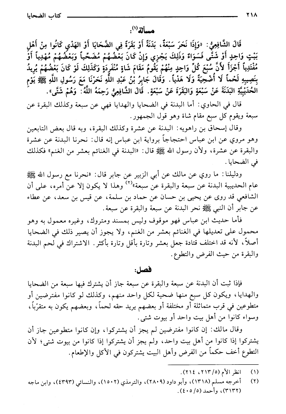 فأما حديث ابن عباس فهو موقوف وليس بمسند ومتروك، وغيره معمول به وهو محمول على تعديلها في الغنائم بعشر من الغنم، ولا يجوز أن يصير ذلك في الضحايا أصلاً، لأنه قد اختلف قتادة جعل بعشر وتارة بأقل وتارة بأكثر. الاشتراك في لحم البدنة والبقرة من حيث الفرض والتطوع.