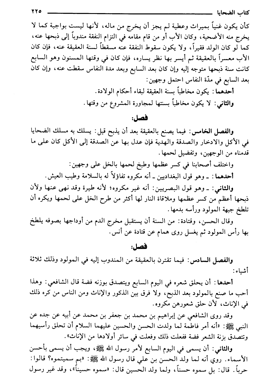 والفصل السادس: فيما تقترن بالعقيقة من المندوب إليه في المولود وذلك ثلاثة أشياء: