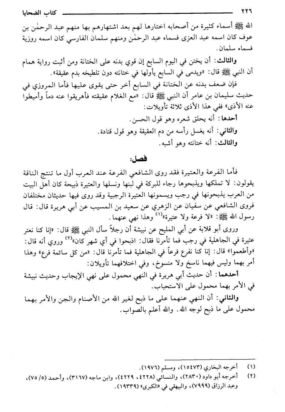 فأما الفرعة والعتيرة فقد روى الشافعي الفرعة عند العرب أول ما تنتج الناقة يقولون: لا تملكها ويذبحوها رجاء للبركة في لبنها ونسلها والعتيرة ذبيحة كان أهل البيت من العرب يذبحونها في رجب ويسمونها العتيرة الرجبية وقد روى فيها حديثان مختلفان فروى الشافعي عن سفيان عن الزهري عن سعيد بن المسيب عن أبي هريرة قال: قال رسول الله - صلى الله عليه وسلم -: "لا فرعة ولا عتيرة" وهذا نهي عنهما.
