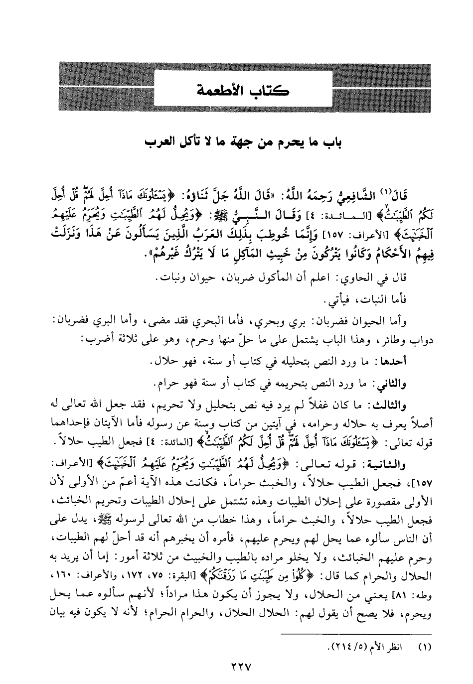 قال الشافعي رحمه الله: "قال الله جل ثناؤه: {يَسْأَلُونَكَ مَاذَا أُحِلَّ لَهُمْ قُلْ أُحِلَّ لَكُمُ الطَّيِّبَاتُ} [المائدة: 4] وقال النبي - صلى الله عليه وسلم - {وَيُحِلُّ لَهُمُ الطَّيِّبَاتِ وَيُحَرِّمُ عَلَيْهِمُ الْخَبَآئِثَ} [الأعراف: 157] وإنما خوطب بذلك العرب الذين يسألون عن هذا ونزلت فيهم الأحكام وكانوا يتركون من خبيث المآكل ما لا يترك غيرهم".